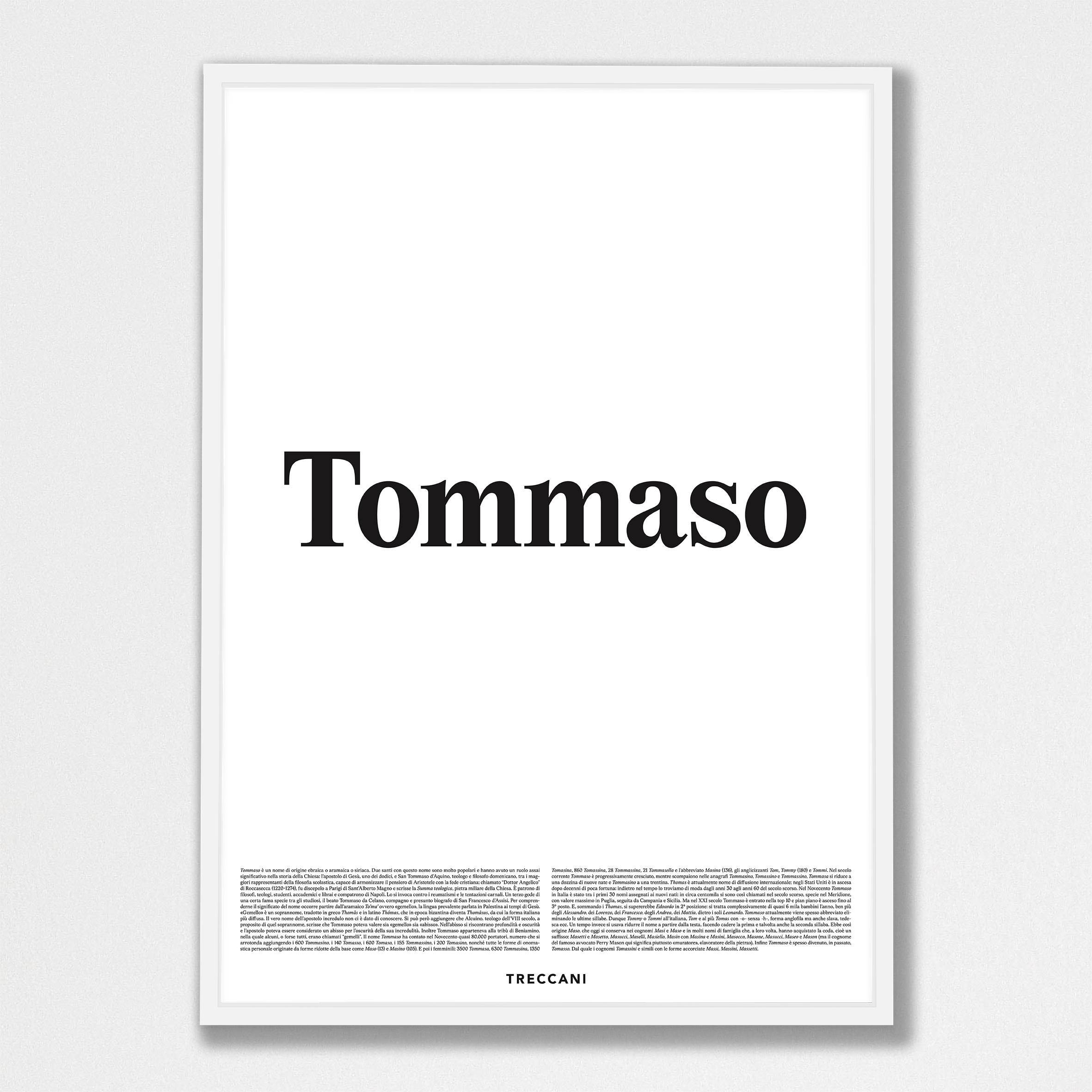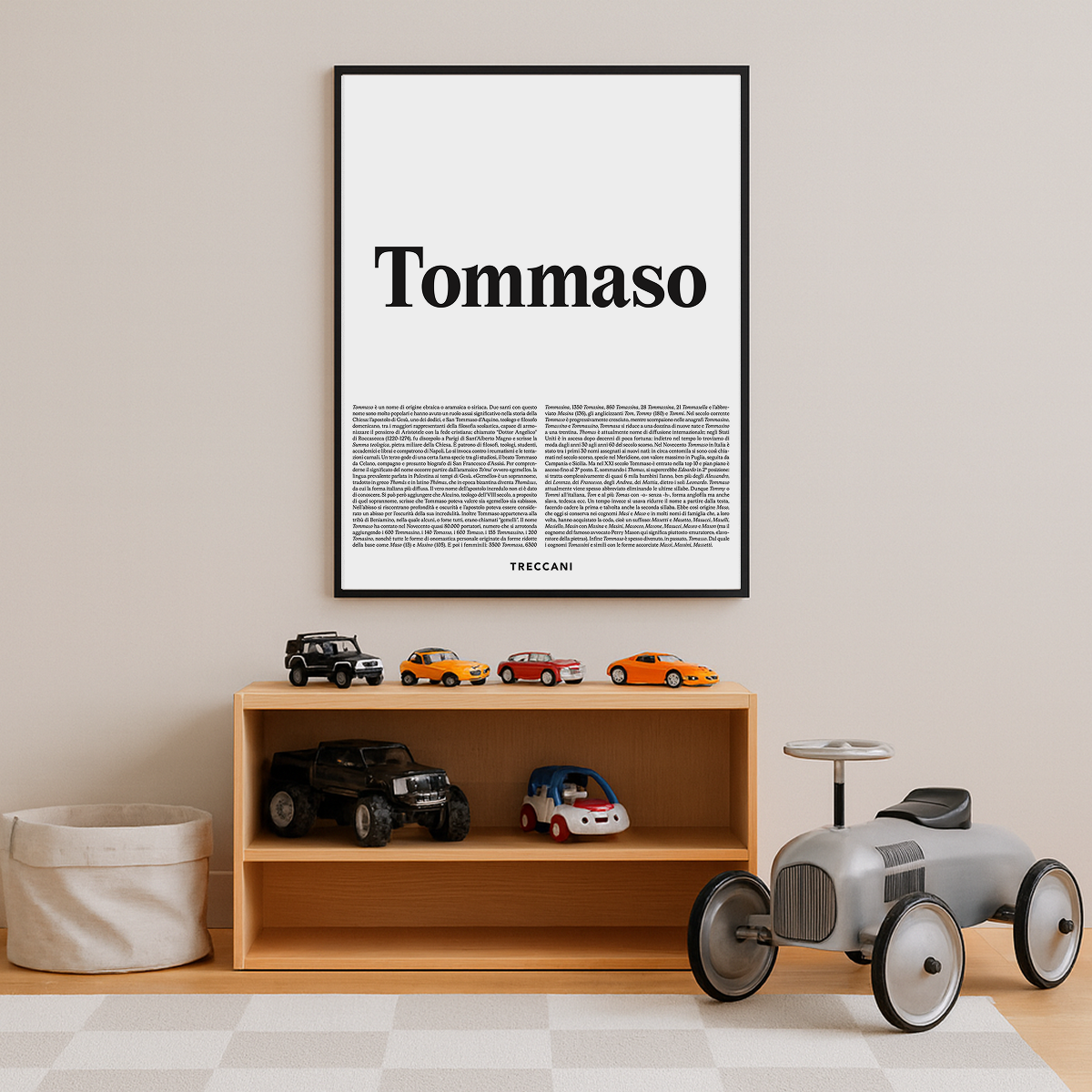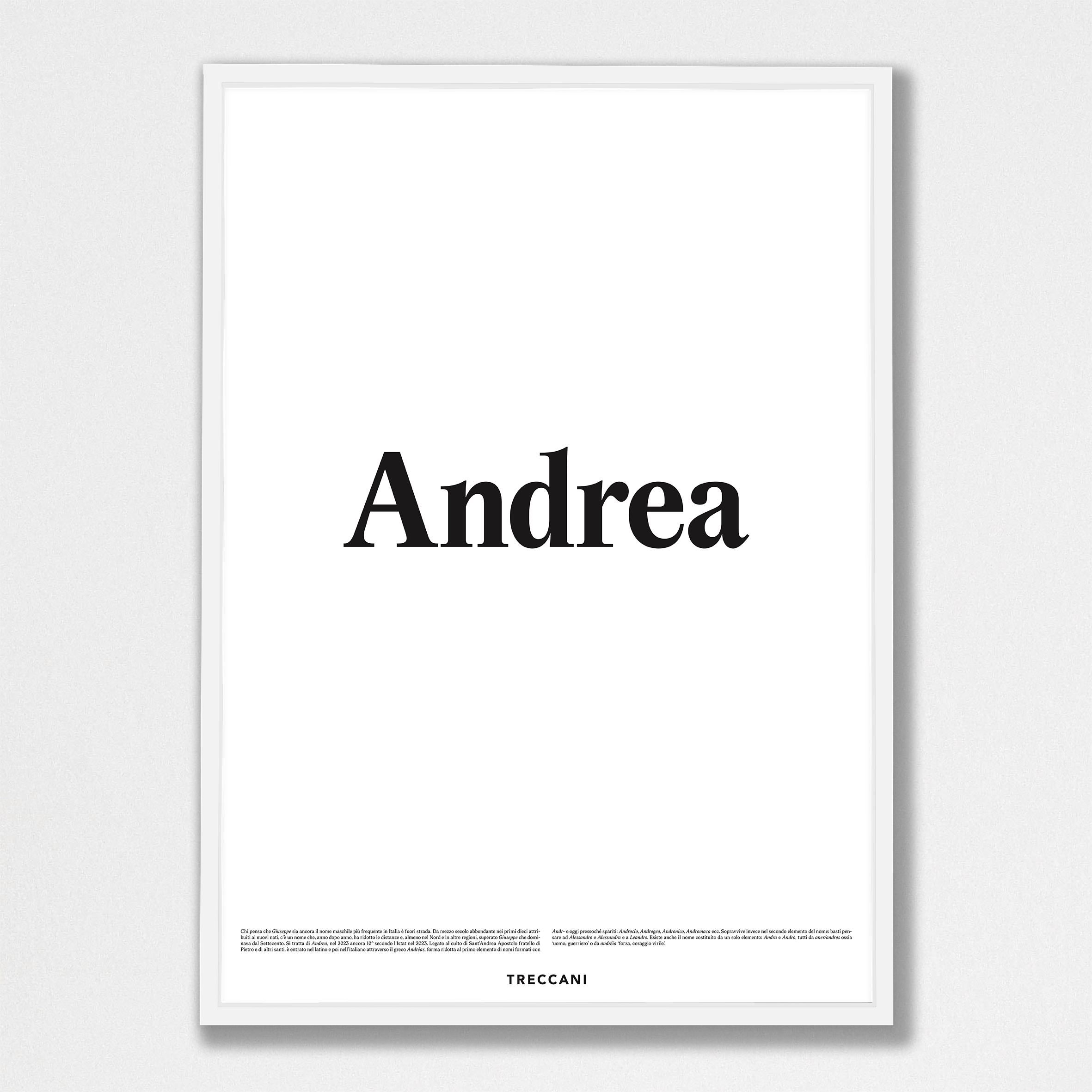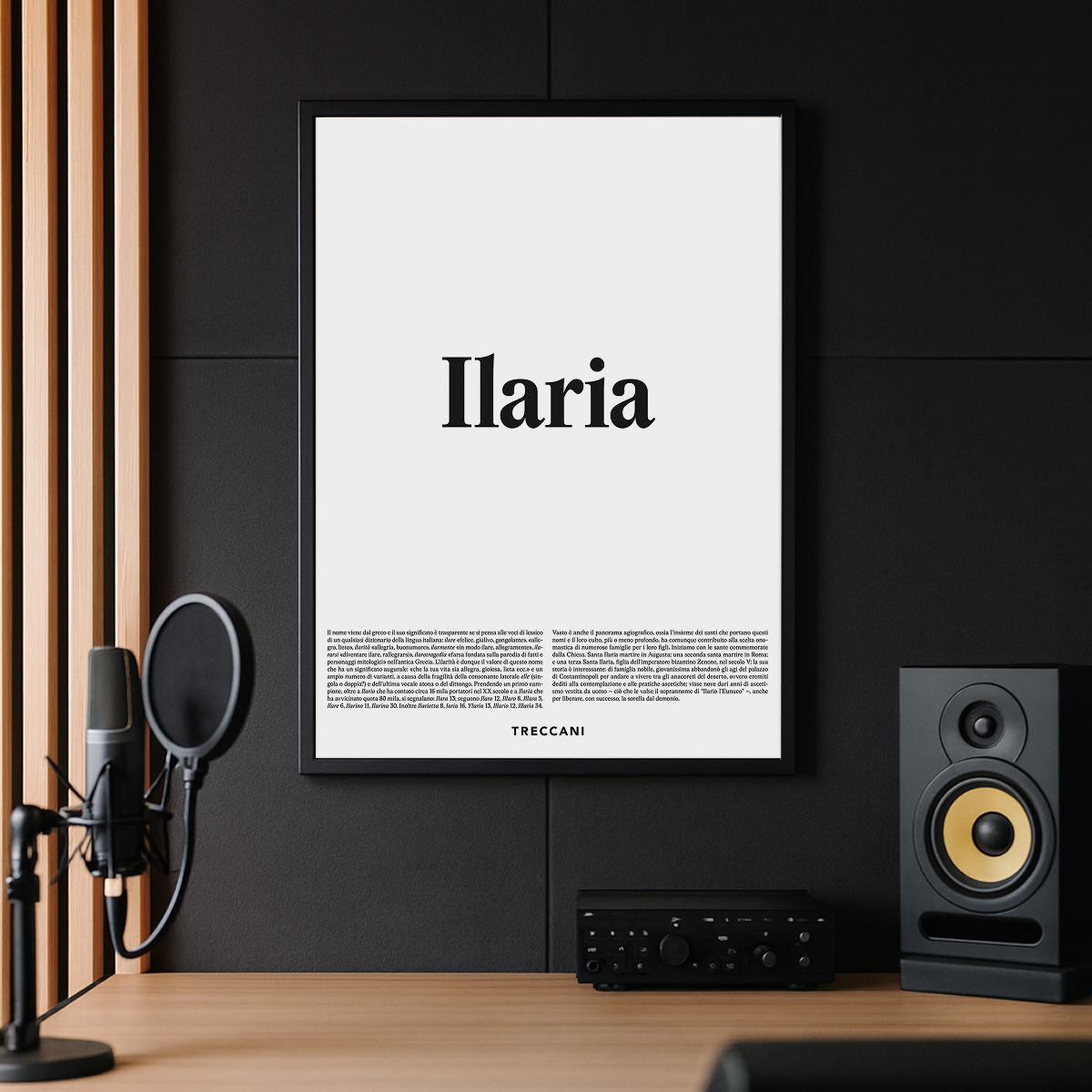Una collezione raffinata che trasforma ogni nome in un oggetto di design consapevole. Ogni poster accoglie un nome accompagnato dalla sua definizione o declinazione espressiva, impaginata con cura grafica e realizzata con materiali di qualità. È un progetto che unisce la passione per la lingua italiana e il gusto per l’arredo contemporaneo: montato alla parete, un nome non è più solo un’etichetta, ma diventa racconto personale e presenza estetica. Ideali per la casa, lo studio o come idea regalo, questi poster incarnano l’identità individuale valorizzata con eleganza, cura artigianale e la tradizione del sapere Treccani.