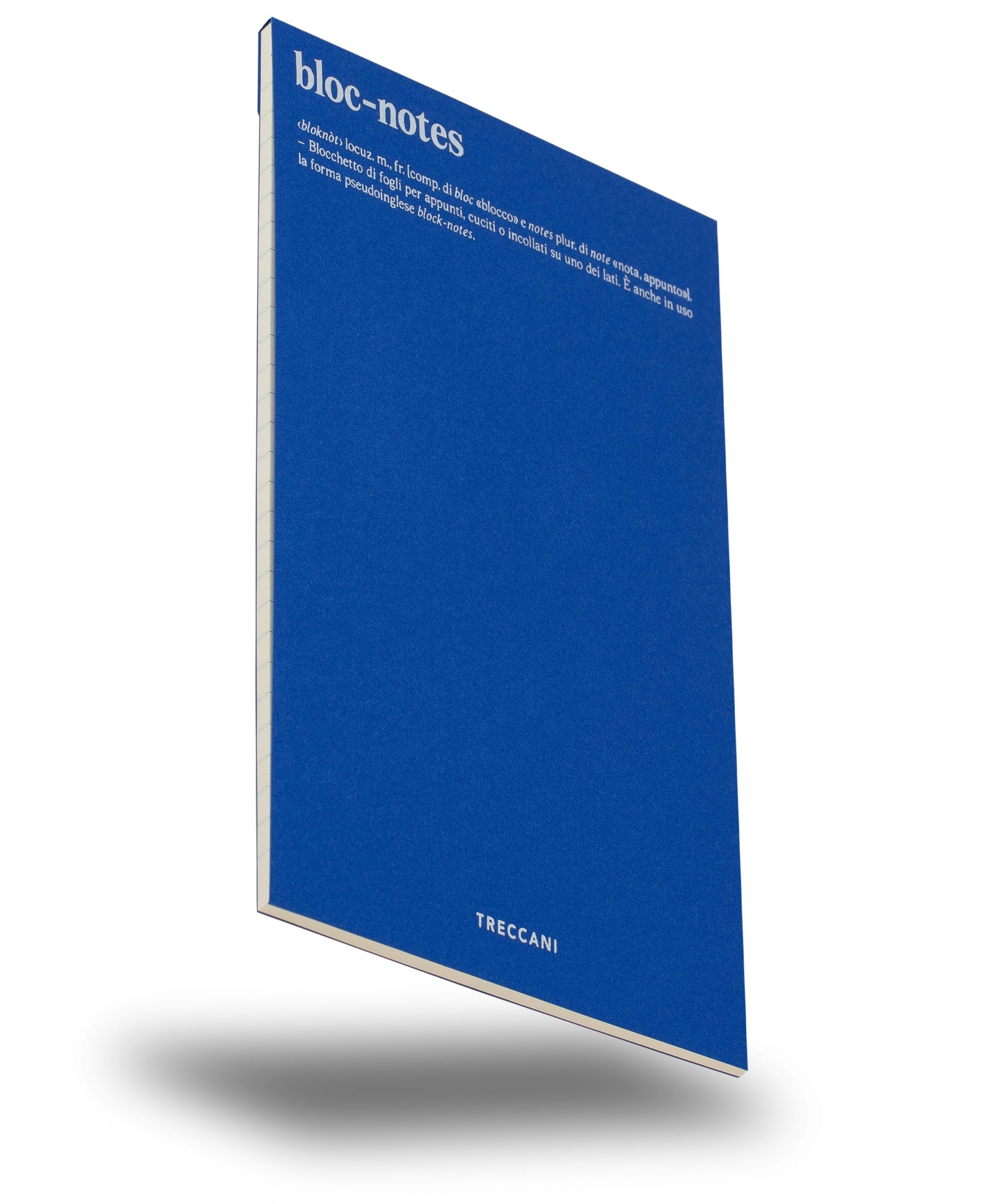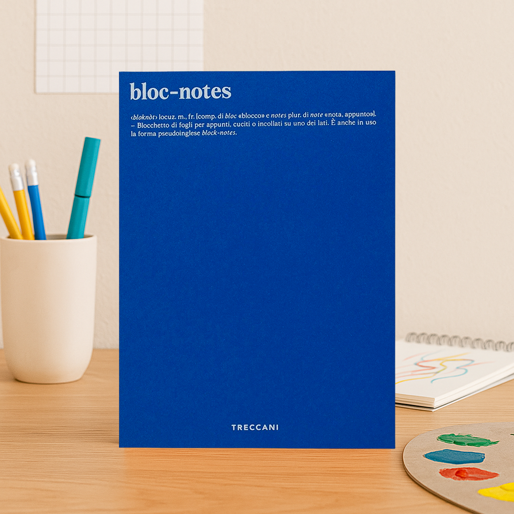 Dallo stile sobrio ed elegante, Bloc-notes è realizzato con carte di pregio delle migliori cartiere italiane e confezionato interamente in Italia. La copertina in cartoncino è stampata a caldo con colore a contrasto. Coniugando funzionalità e design, perizia artigianale ed estro concettuale, sapere e saper fare, il bloc-notes Treccani ci invita a riscoprire la storia dell’oggetto e l’etimologia della parola “bloc-notes”, attraverso la sua definizione sul Vocabolario Treccani.
