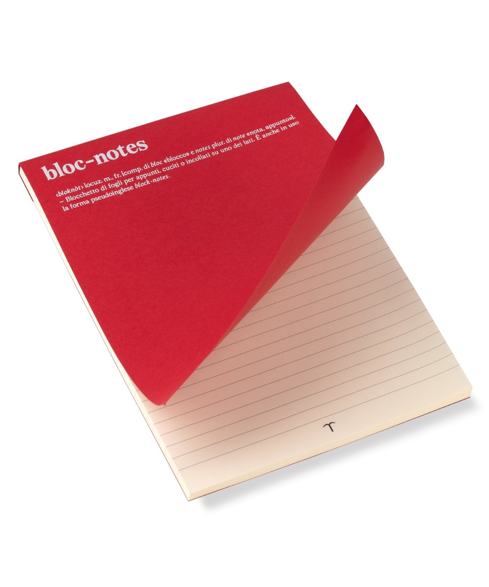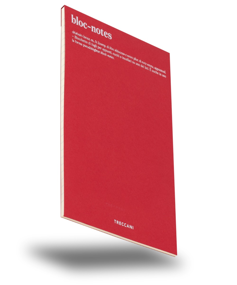 Dallo stile sobrio ed elegante, Bloc-notes è realizzato con carte di pregio delle migliori cartiere italiane e confezionato interamente in Italia. La copertina in cartoncino è stampata a caldo con colore a contrasto. Coniugando funzionalità e design, perizia artigianale ed estro concettuale, sapere e saper fare, il bloc-notes Treccani ci invita a riscoprire la storia dell’oggetto e l’etimologia della parola “bloc-notes”, attraverso la sua definizione sul Vocabolario Treccani.
