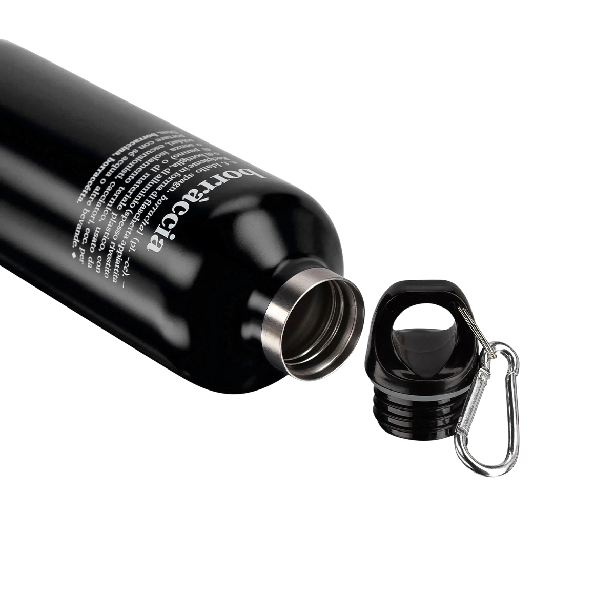 Dettagli | Borraccia termica in acciaio inossidabile per uso alimentare; Tappo in polipropilene a tenuta stagna con moschettone; Diametro 7,3cm; Altezza 23cm; Capienza 500ml |