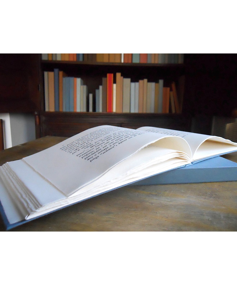 Tiratura limitata di 170 esemplari numerati. Un volume in formato album (8x25 cm) di 72 pagine composte a mano con i caratteri Caslon corpo 16, sbalzati a mano su punzone da William Caslon nella prima metà del Settecento. |