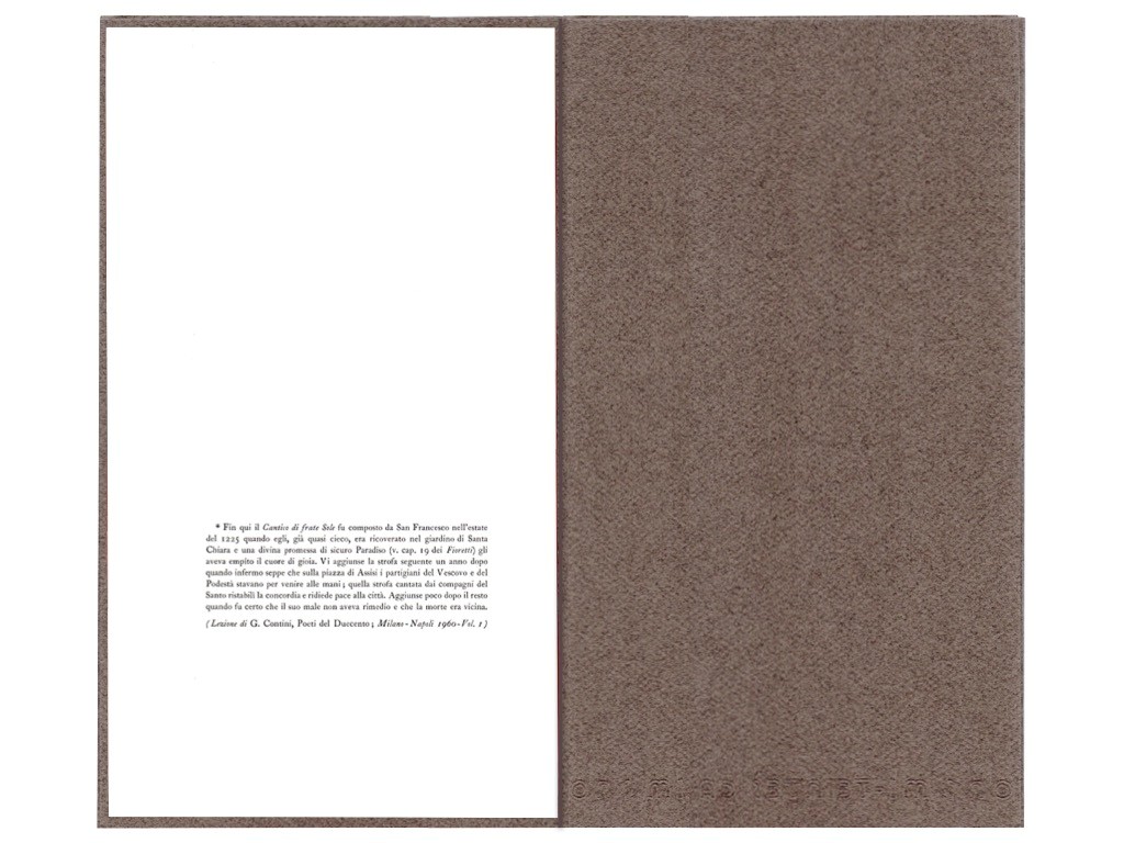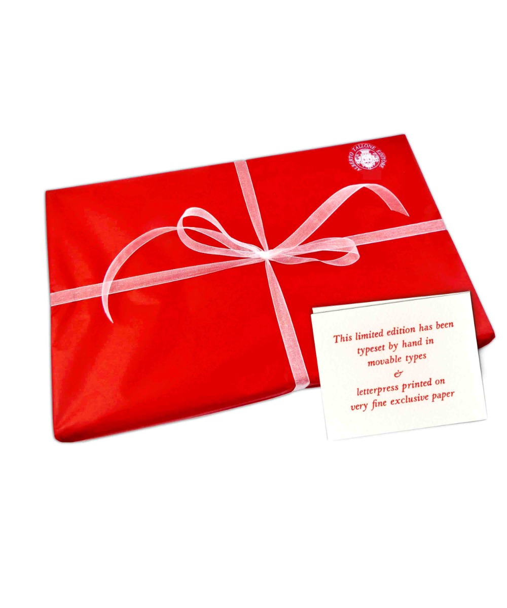 Composto a mano, lettera per lettera, con gli esclusivi caratteri Tallone corpo 12. Stampato su carta di pregio a lunga conservazione prodotta in Italia. Dimensione: 17,5 x 30,5 cm Quartino di quattro pagine inserito in una cartella di cartoncino. |