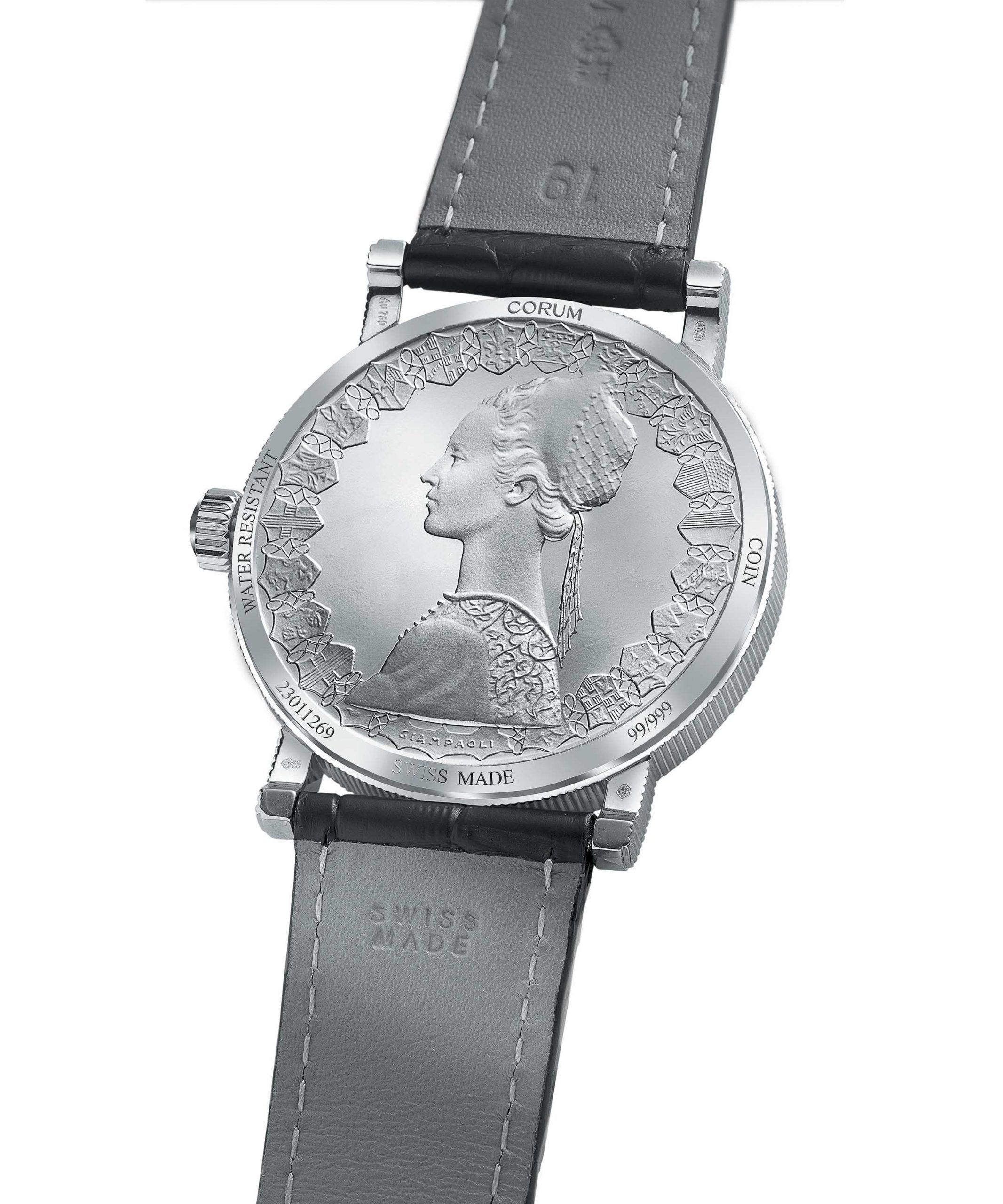 Orologio modello Coin Watch con coniazioni della Zecca dello Stato; L.500 Caravelle del 1957 realizzate in acciaio.; Cinturino in pelle, Cassa Ø 36 mm acciaio, cinturino in pelle nera, Swiss Made movimento automatico SW300-1, chiusura ad ardiglione; Tiratura 999 esemplari |