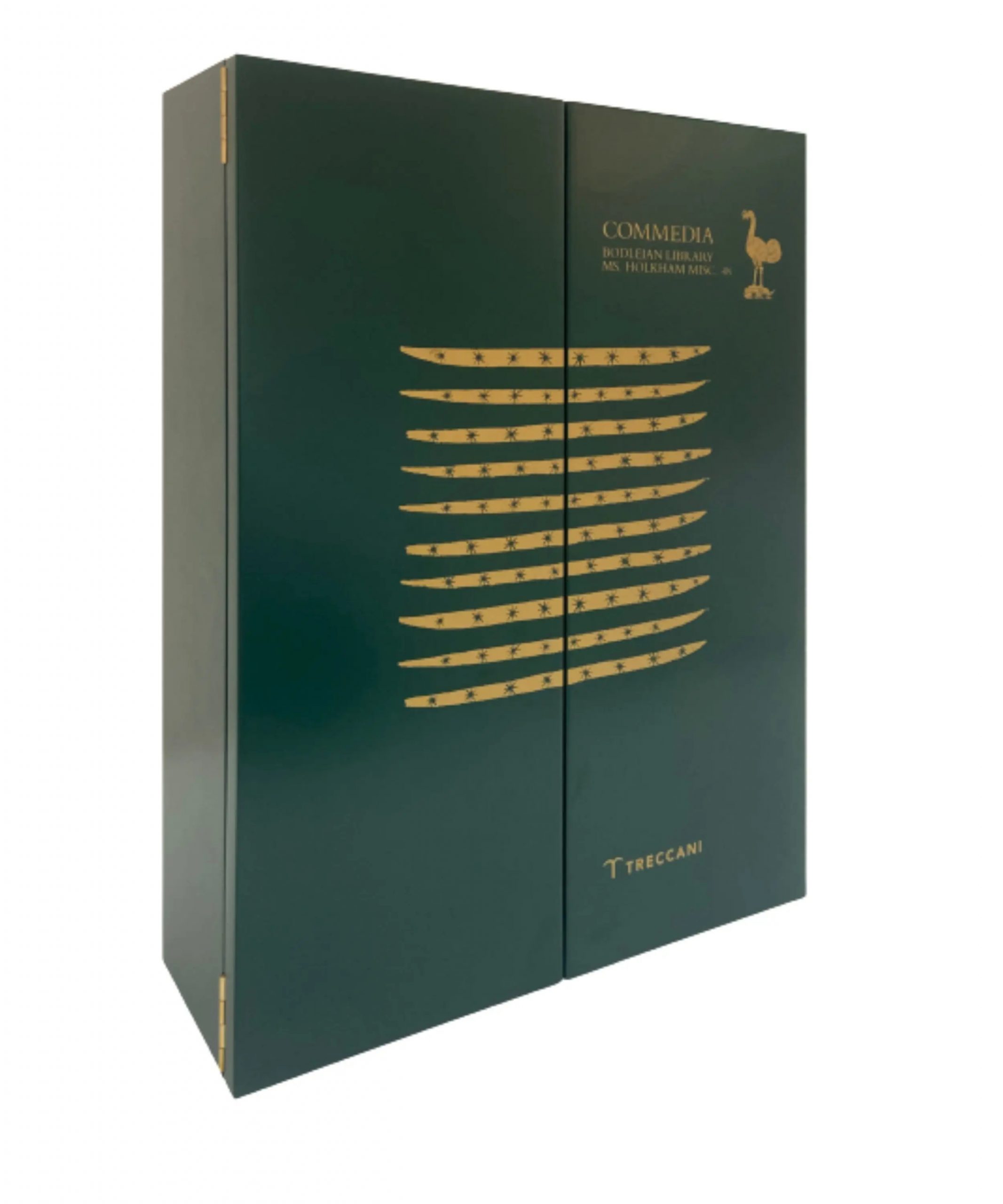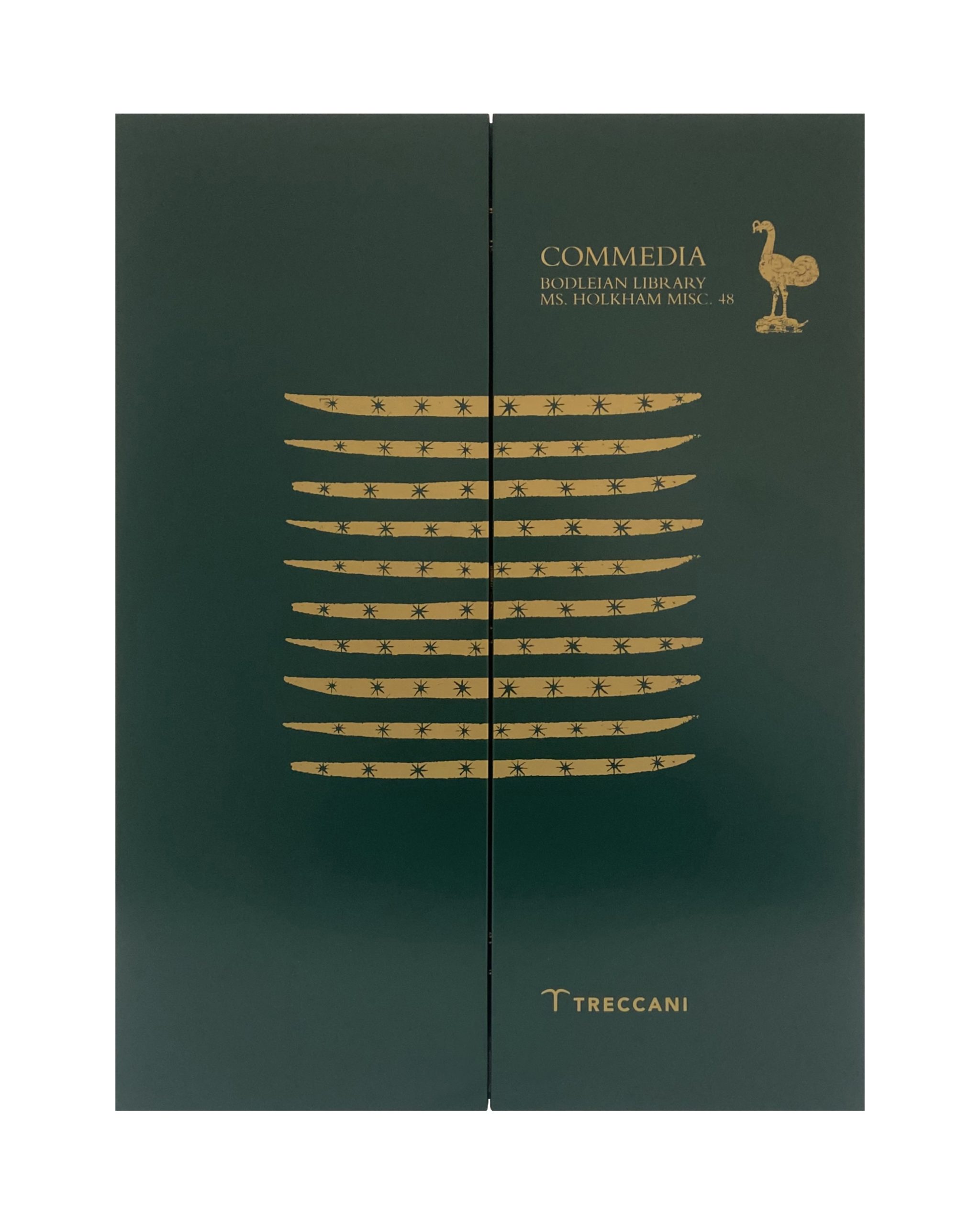 Il facsimile riproduce il codice membranaceo, di formato 35,5 × 23,5 cm, composto da ff. III, 74, III’ (I-III e I’-III’ cart. mod. bianche le pp. 55-56), con numerazione recente a matita per pagine nell’angolo esterno delle carte da pag. 1 a pag. 148 (numerate per pagine anche le carte di guardia anteriori, da «i» a «vi», e posteriori da 149 a 154). Il facsimile è stampato con retino stocastico a cinque colori più oro e argento su carta pergamenata Stucco delle Cartiere Fedrigoni. I risguardi sono stampati a quattro colori su carta Ingres delle Cartiere Fabriano. La legatura è in pelle primo fiore di colore verde con nervi e impressioni a caldo e bassorilievo sul piatto e sul dorso. La tiratura è di 399 esemplari numerati a mano da 1 a 399 più 10 esemplari fuori numerazione. Il commentario si compone di oltre 190 pagine con 33 tavole a colori. Il facsimile e il commentario sono custoditi in un cofanetto in legno laccato lucido di colore verde con grafica in oro che riproduce lo struzzo presente nello stemma impresso sulla copertina del manoscritto e i motivi dei cieli delle miniature del Paradiso. Il cofanetto è rivestito all’interno in Alcantara con sistema a leggio integrato e vano inferiore per il commentario. |