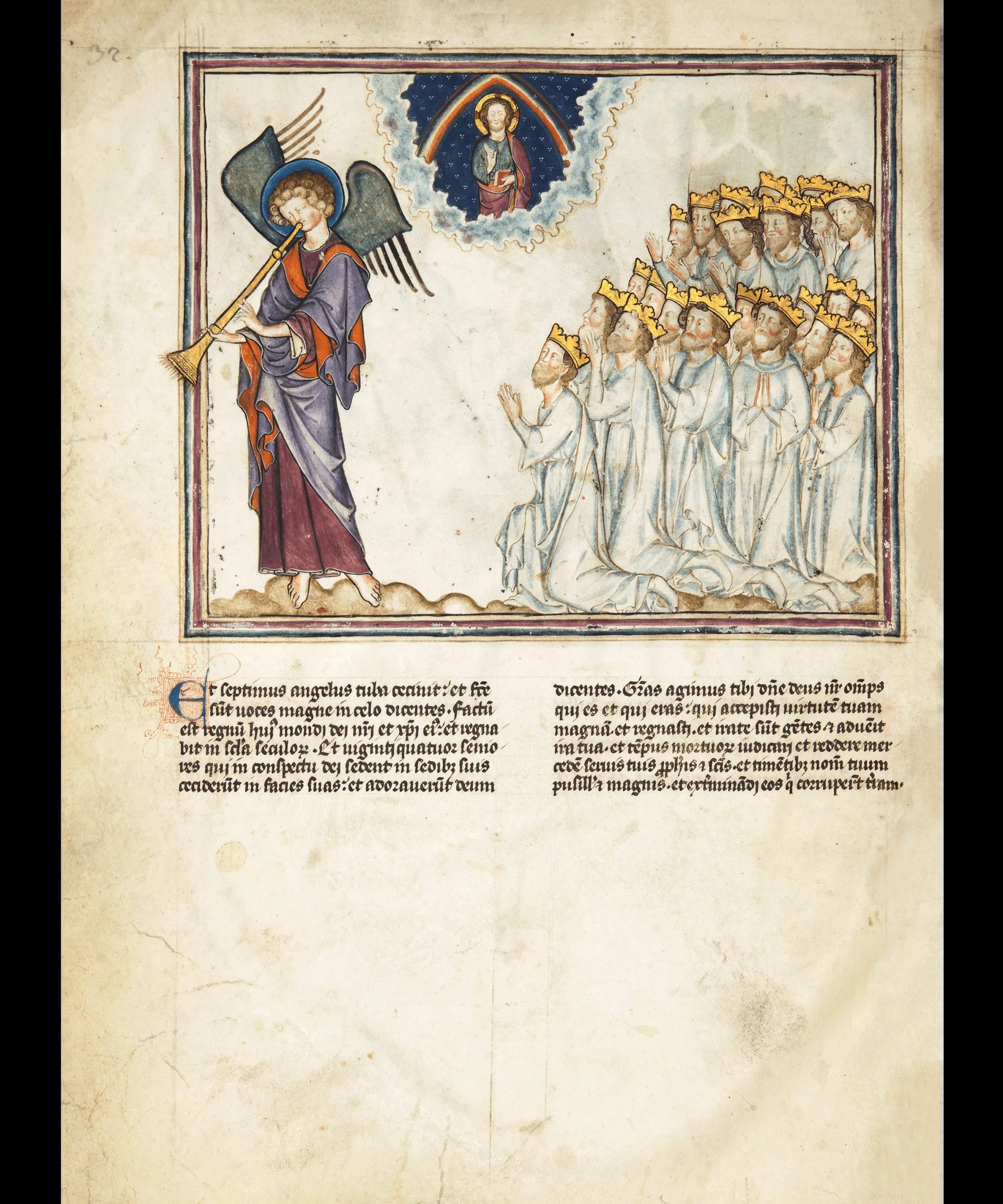 Nonostante la sua difficile lettura e l’ancora più complessa analisi esegetica, per comprendere il testo e il suomessaggio bisogna prendere in considerazione il difficile momento storico in cui l’autore scrisse. Infatti, le persecuzionida parte di Domiziano nei confronti dei cristiani portarono i fedeli a una profonda crisi spirituale. Come Giovanni,influenzato da quei brutali eventi, anche i fedeli dell’epoca me-dievale rintracciarono nel proprio tempo i segnali di decadenzae di bisogno di rinnovamento inneggiati nell’Apocalisse. Fucosì che religiosi ed esegeti presero la profezia come chiavedi lettura del loro presente e futuro. Tra questi, ve ne fu unoin particolare a ravvivare l’interesse per il messaggio esca-tologico tramandato dal testo giovanneo: Gioacchino daFiore (1135 circa-1202), monaco cistercense vissuto du-rante il XII secolo, che portò all’attenzione di classi socialielevate e non una nuova visione della storia e del futuronella sua opera Expositio in Apocalypsim. La fine, cosìcome descritta nell’Apocalisse giovannea, sembravaavvicinarsi e gli eventi storici del tempo sembravano confermarlo. Il testo neotestamentario venne spessocopiato, dando vita a cicli illustrativi complessi, rea-lizzati per opere sia di piccolo sia di grande formato.L’iconografia divenne ricorrente, sia per la decora-zione delle pagine dei manoscritti sia per gli in-terni delle chiese. Databile al secondo quarto del XIV secolo circa e realizzato probabilmente nel nord della Francia, in Normandia occi-dentale, questo esemplare è stato spesso inserito in una specifica categoria di manoscritti contenenti l’Apocalisse gio-vannea, ovvero quella anglo-francese. In particolare, però, questo esemplare presenta due manoscritti ’fratelli’, simili senon addirittura uguali dal punto vista iconografico e stilistico (Londra, British Library, Add. ms. 17333, Val-Dieu Apocalypse,e New York, Metropolitan Museum of Art, Cloisters Collection, ms. 68.174, Cloisters Apocalypse). |