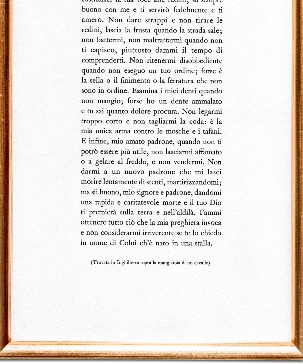Trovata in Inghilterra sopra la mangiatoia di un cavallo. Composta a mano con il carattere inglese Caslon corpo 16, è impressa su carta pregiata di cotone allestita in Italia.