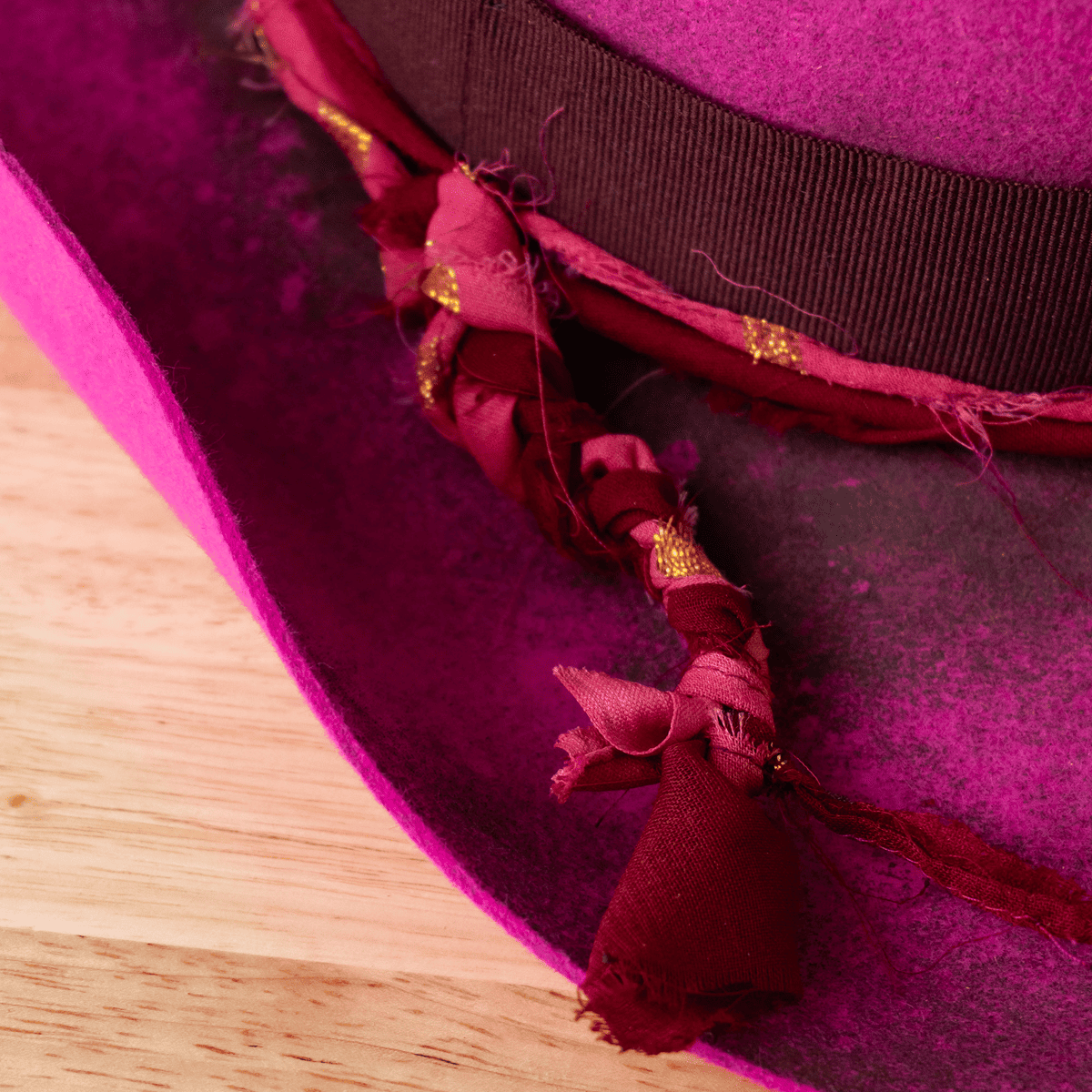 Ogni cappello è modellato con il vapore su forme di legno, poi dipinto, decorato e cucito interamente a mano con strumenti tradizionali, nel profondo rispetto della qualità e dell’autenticità delle creazioni artigianali.