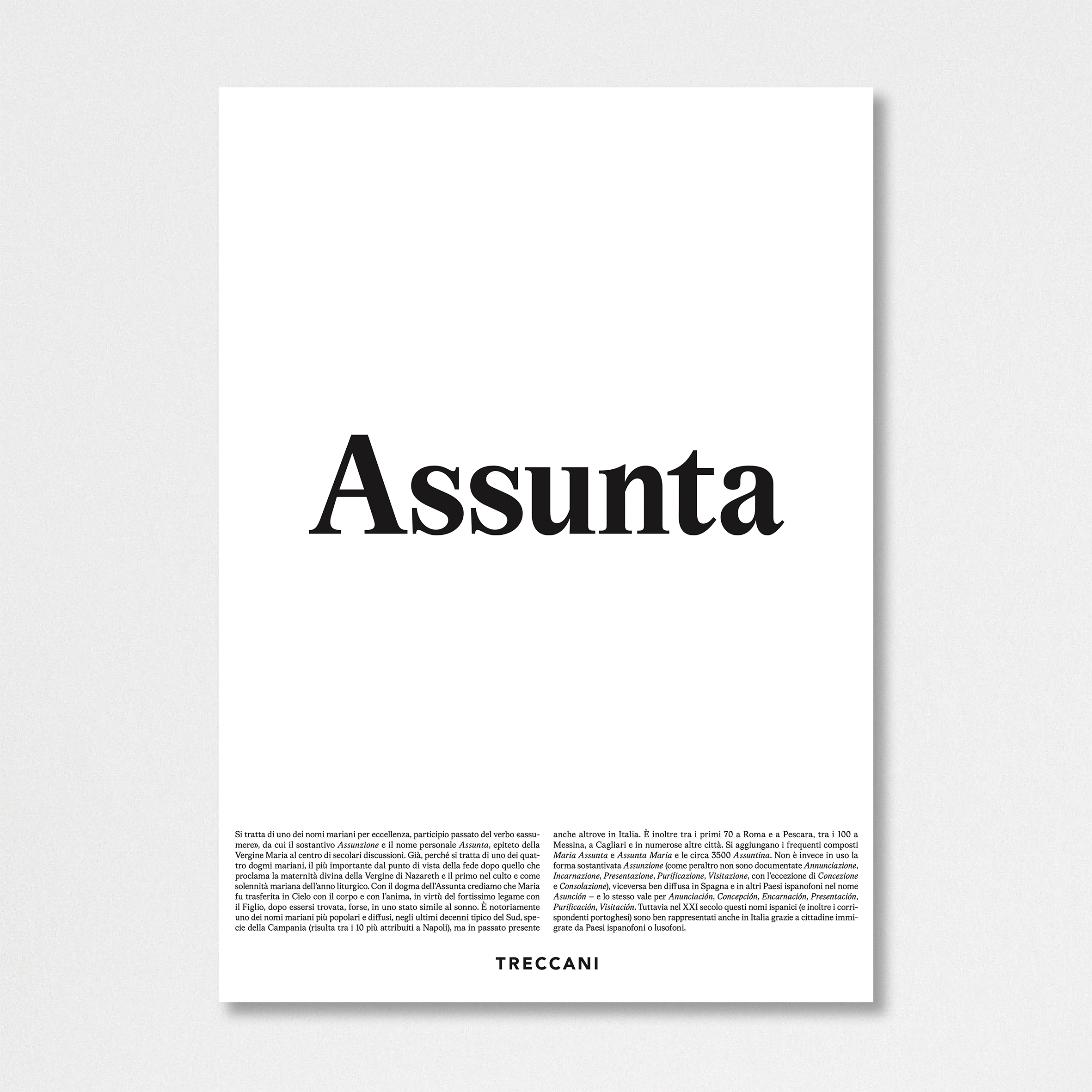 | Definizione | Si tratta di uno dei nomi mariani per eccellenza, participio passato del verbo «assumere», da cui il sostantivo Assunzione e il nome personale Assunta, epiteto della Vergine Maria al centro di secolari discussioni. Già, perché si tratta di uno dei quattro dogmi mariani, il più importante dal punto di vista della fede dopo quello che proclama la maternità divina della Vergine di Nazareth e il primo nel culto e come solennità mariana dell’anno liturgico. Con il dogma dell’Assunta crediamo che Maria fu trasferita in Cielo con il corpo e con l’anima, in virtù del fortissimo legame con il Figlio, dopo essersi trovata, forse, in uno stato simile al sonno. È notoriamente uno dei nomi mariani più popolari e diffusi, negli ultimi decenni tipico del Sud, specie della Campania (risulta tra i 10 più attribuiti a Napoli), ma in passato presente anche altrove in Italia. È inoltre tra i primi 70 a Roma e a Pescara, tra i 100 a Messina, a Cagliari e in numerose altre città. Si aggiungano i frequenti composti Maria Assunta e Assunta Maria e le circa 3500 Assuntina. Non è invece in uso la forma sostantivata Assunzione (come peraltro non sono documentate Annunciazione, Incarnazione, Presentazione, Purificazione, Visitazione, con l’eccezione di Concezione e Consolazione), viceversa ben diffusa in Spagna e in altri Paesi ispanofoni nel nome Asunción – e lo stesso vale per Anunciación, Concepción, Encarnación, Presentación, Purificación, Visitación. Tuttavia nel XXI secolo questi nomi ispanici (e inoltre i corrispondenti portoghesi) sono ben rappresentati anche in Italia grazie a cittadine immigrate da Paesi ispanofoni o lusofoni. |