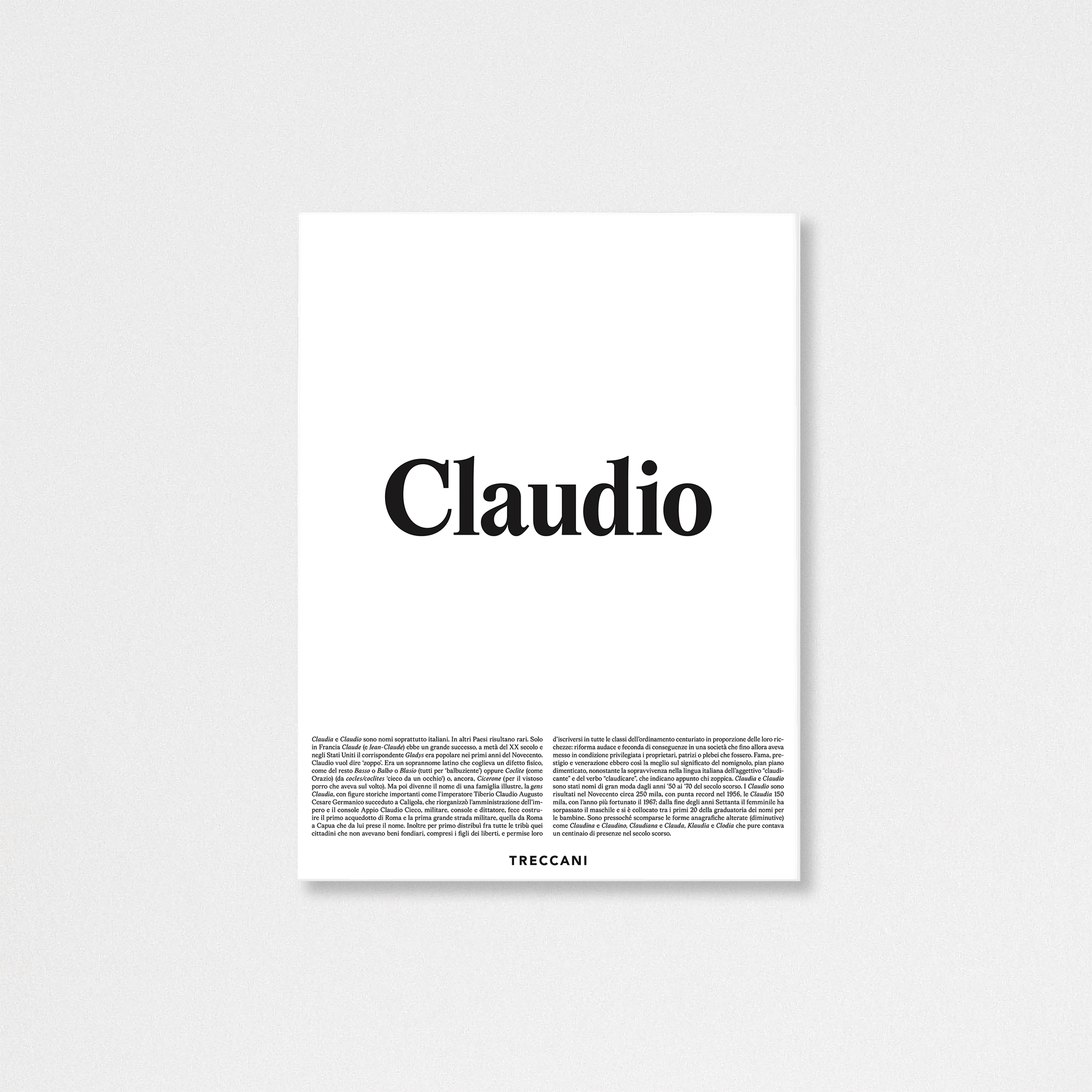 | Definizione | Claudia e Claudio sono nomi soprattutto italiani. In altri Paesi risultano rari. Solo in Francia Claude (e Jean-Claude) ebbe un grande successo, a metà del XX secolo e negli Stati Uniti il corrispondente Gladys era popolare nei primi anni del Novecento. Claudio vuol dire ‘zoppo’. Era un soprannome latino che coglieva un difetto fisico, come del resto Basso o Balbo o Blasio (tutti per ‘balbuziente’) oppure Coclite (come Orazio) (da cocles/coclites ‘cieco da un occhio‘) o, ancora, Cicerone (per il vistoso porro che aveva sul volto). Ma poi divenne il nome di una famiglia illustre, la gens Claudia, con figure storiche importanti come l’imperatore Tiberio Claudio Augusto Cesare Germanico succeduto a Caligola, che riorganizzò l’amministrazione dell’im¬pero e il console Appio Claudio Cieco, militare, console e dittatore, fece costru¬ire il primo acquedotto di Roma e la prima grande strada militare, quella da Roma a Capua che da lui prese il nome. Inoltre per primo distribuì fra tutte le tribù quei cittadini che non avevano beni fondiari, compresi i figli dei liberti, e permise loro d’iscriversi in tutte le classi dell’ordinamento centuriato in proporzione delle loro ric¬chezze: riforma audace e feconda di conseguenze in una società che fino allora aveva messo in condizione privilegiata i proprietari, patrizi o plebei che fossero. Fama, pre¬stigio e venerazione ebbero così la meglio sul significato del nomignolo, pian piano dimenticato, nonostante la sopravvivenza nella lingua italiana dell’aggettivo “claudi¬cante” e del verbo “claudicare”, che indicano appunto chi zoppica. Claudia e Claudio sono stati nomi di gran moda dagli anni ’50 ai ’70 del secolo scorso. I Claudio sono risultati nel Novecento circa 250 mila, con punta record nel 1956, le Claudia 150 mila, con l’anno più fortunato il 1967; dalla fine degli anni Settanta il femminile ha sorpassato il maschile e si è collocato tra i primi 20 della graduatoria dei nomi per le bambine. Sono pressoché scomparse le forme anagrafiche alterate (diminutive) come Claudina e Claudino, Claudiana e Clauda, Klaudia e Clodia che pure contava un centinaio di presenze nel secolo scorso. |