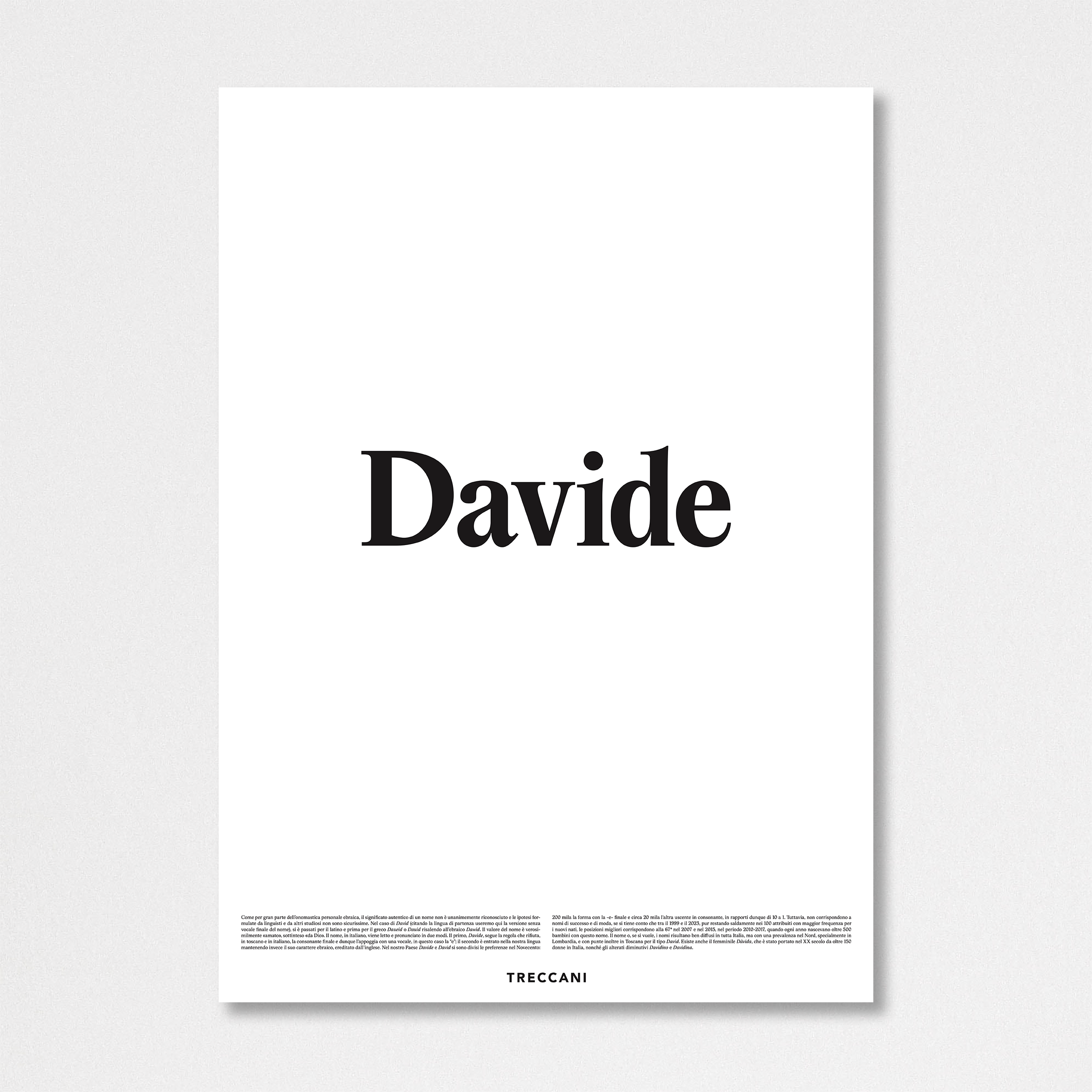 | Definizione | Come per gran parte dell’onomastica personale ebraica, il significato autentico di un nome non è unanimemente riconosciuto e le ipotesi formulate da linguisti e da altri studiosi non sono sicurissime. Nel caso di David (citando la lingua di partenza useremo qui la versione senza vocale finale del nome), si è passati per il latino e prima per il greco Daueid o Dauid risalendo all’ebraico Dawid. Il valore del nome è verosimilmente «amato», sottinteso «da Dio». Il nome, in italiano, viene letto e pronunciato in due modi. Il primo, Davide, segue la regola che rifiuta, in toscano e in italiano, la consonante finale e dunque l’appoggia con una vocale, in questo caso la “e”; il secondo è entrato nella nostra lingua mantenendo invece il suo carattere ebraico, ereditato dall’inglese. Nel nostro Paese Davide e David si sono divisi le preferenze nel Novecento: 200 mila la forma con la -e- finale e circa 20 mila l’altra uscente in consonante, in rapporti dunque di 10 a 1. Tuttavia, non corrispondono a nomi di successo e di moda, se si tiene conto che tra il 1999 e il 2023, pur restando saldamente nei 100 attribuiti con maggior frequenza per i nuovi nati, le posizioni migliori corrispondono alla 67ª nel 2007 e nel 2015, nel periodo 2010-2017, quando ogni anno nascevano oltre 500 bambini con questo nome. Il nome o, se si vuole, i nomi risultano ben diffusi in tutta Italia, ma con una prevalenza nel Nord, specialmente in Lombardia, e con punte inoltre in Toscana per il tipo David. Esiste anche il femminile Davida, che è stato portato nel XX secolo da oltre 150 donne in Italia, nonché gli alterati diminutivi Davidino e Davidina. |