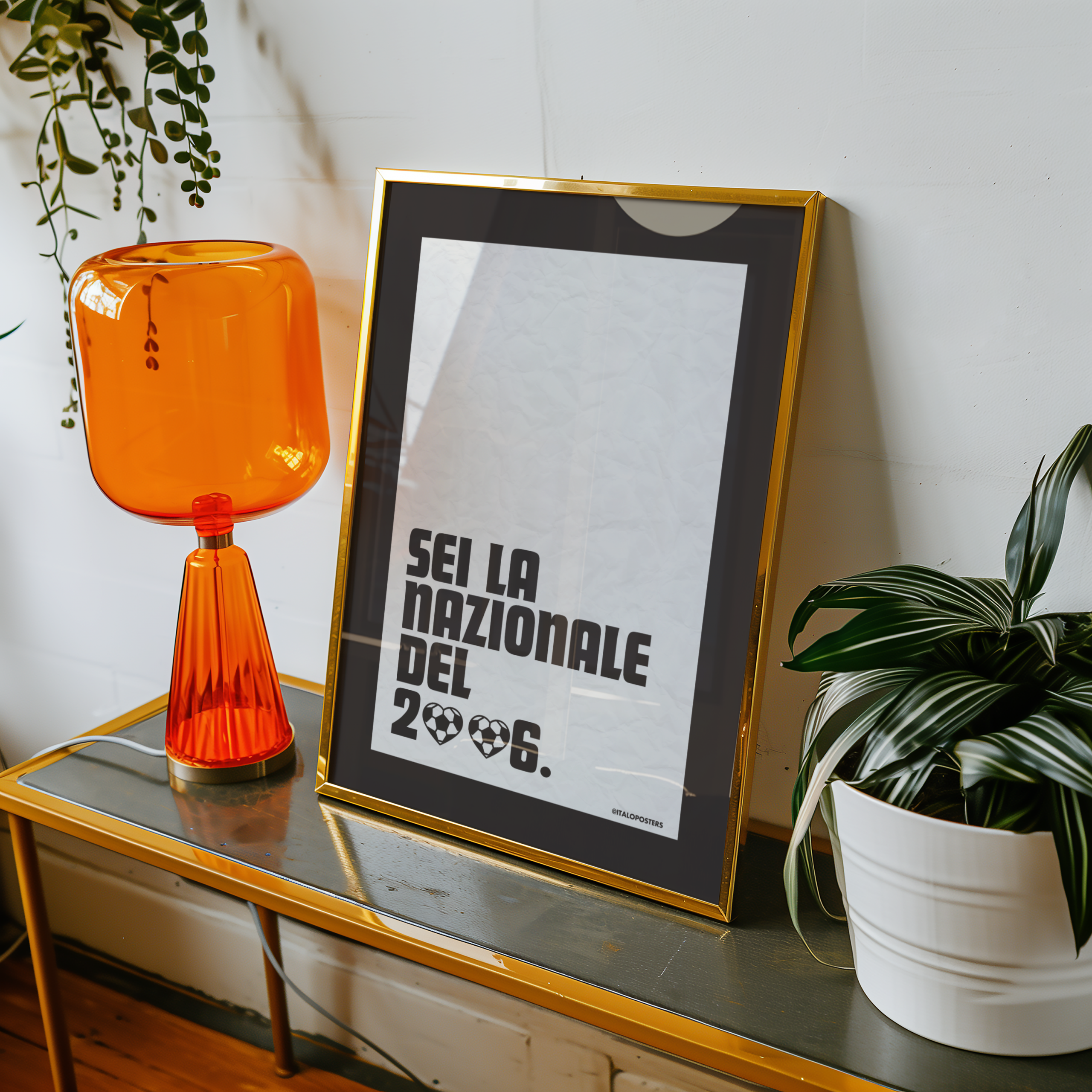 Celebra il trionfo dell’Italia ai Mondiali 2006 con un poster italiano dal design moderno, ispirato alla passione per il calcio e alla cultura italiana. Questa stampa unica combina l’arte contemporanea con l’orgoglio azzurro, rendendola perfetta per decorare casa o ufficio con stile. Ideale per gli amanti delle stampe italiane, del calcio e della musica pop italiana.