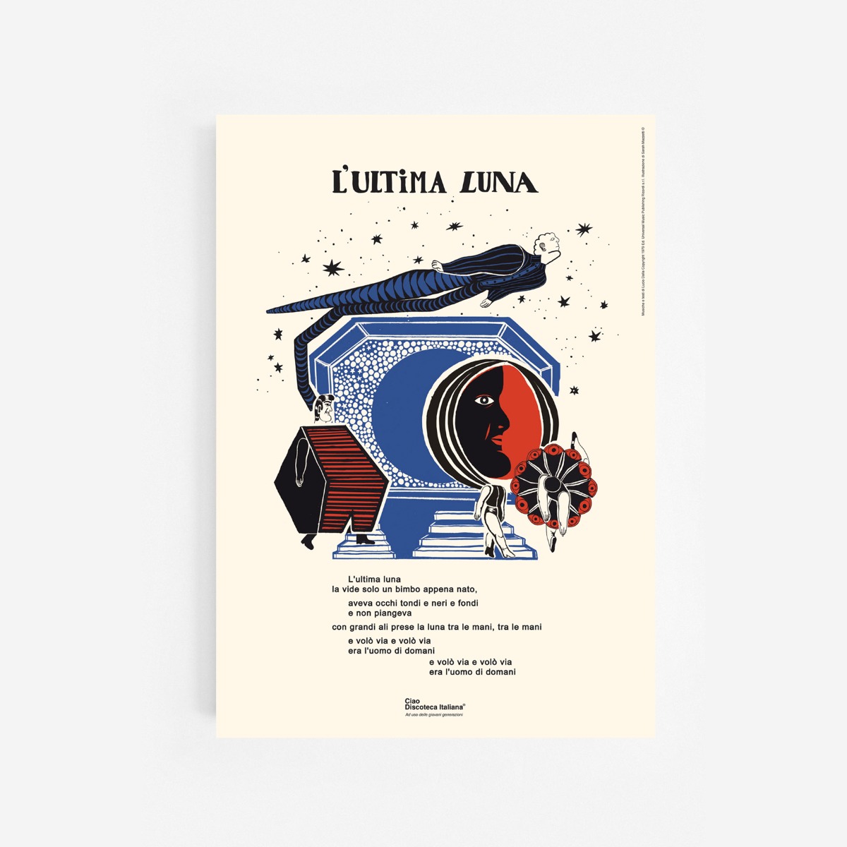 Omaggio a Lucio Dalla nella prima edizione realizzata nel formato 35x50cm su carta Fedrigoni Woodstock Betulla 170g. Un manifesto ispirato ai Tarocchi e alla loro simbologia. In particolare l’arcano della Luna in cui il crostaceo rappresenta l’essere umano che tenta di congiungersi con lo spirituale e il celeste. La tavola è tratta dal libro ‘Il Parco della Luna’ di Lucio Dalla.