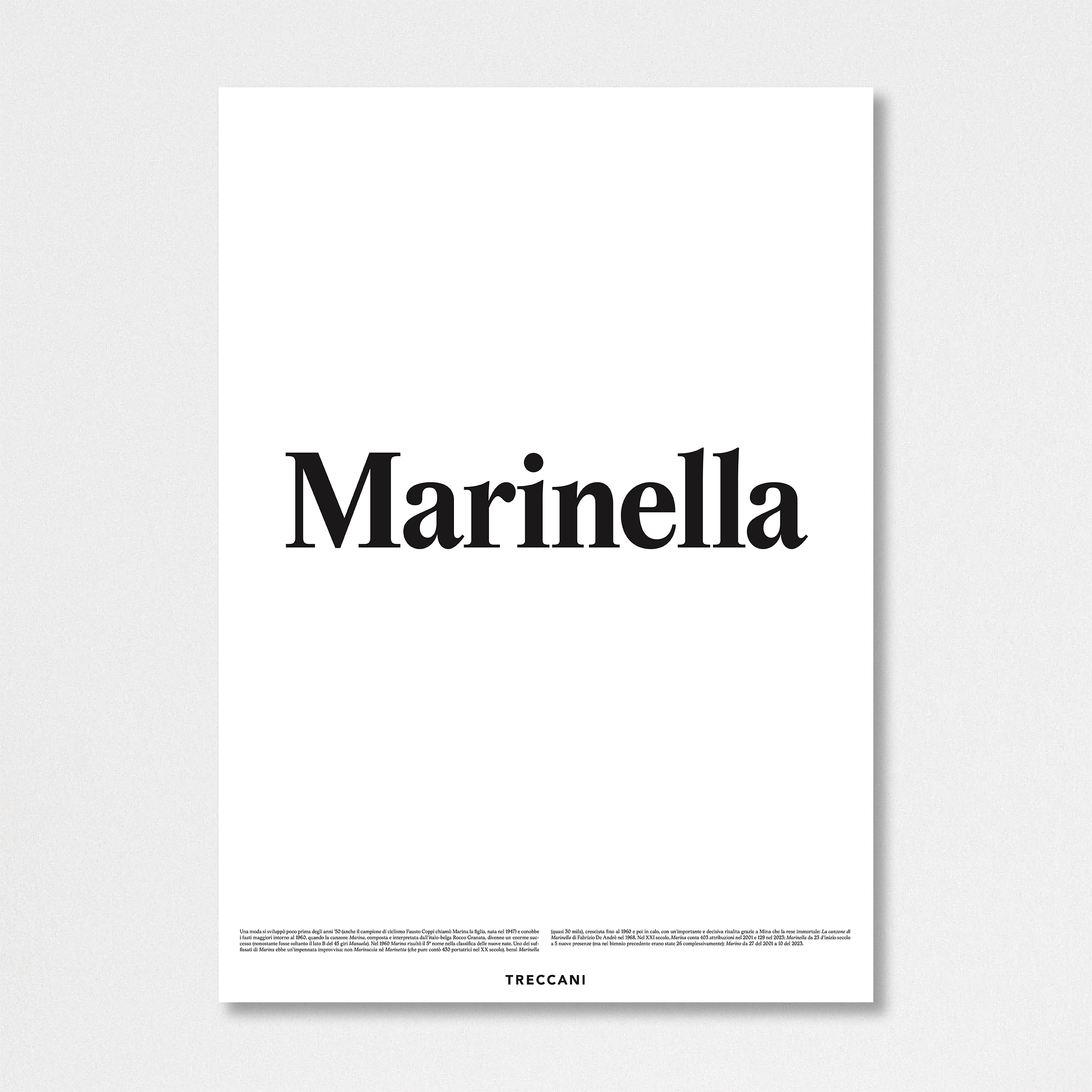 | Definizione | Una moda si sviluppò poco prima degli anni ’50 (anche il campione di ciclismo Fausto Coppi chiamò Marina la figlia, nata nel 1947) e conobbe i fasti maggiori intorno al 1960, quando la canzone Marina, composta e interpretata dall’italo-belga Rocco Granata, divenne un enorme successo (nonostante fosse soltanto il lato B del 45 giri Manuela). Nel 1960 Marina risultò il 5º nome nella classifica delle nuove nate. Uno dei suffissati di Marina ebbe un’impennata improvvisa: non Marinuccia né Marinetta (che pure contò 430 portatrici nel XX secolo), bensì Marinella (quasi 30 mila), cresciuta fino al 1960 e poi in calo, con un’importante e decisiva risalita grazie a Mina che la rese immortale: La canzone di Marinella di Fabrizio De Andrè nel 1968. Nel XXI secolo, Marina conta 403 attribuzioni nel 2001 e 129 nel 2023; Marinella da 23 d’inizio secolo a 5 nuove presenze (ma nel biennio precedente erano state 26 complessivamente); Marino da 27 del 2001 a 10 del 2023. |