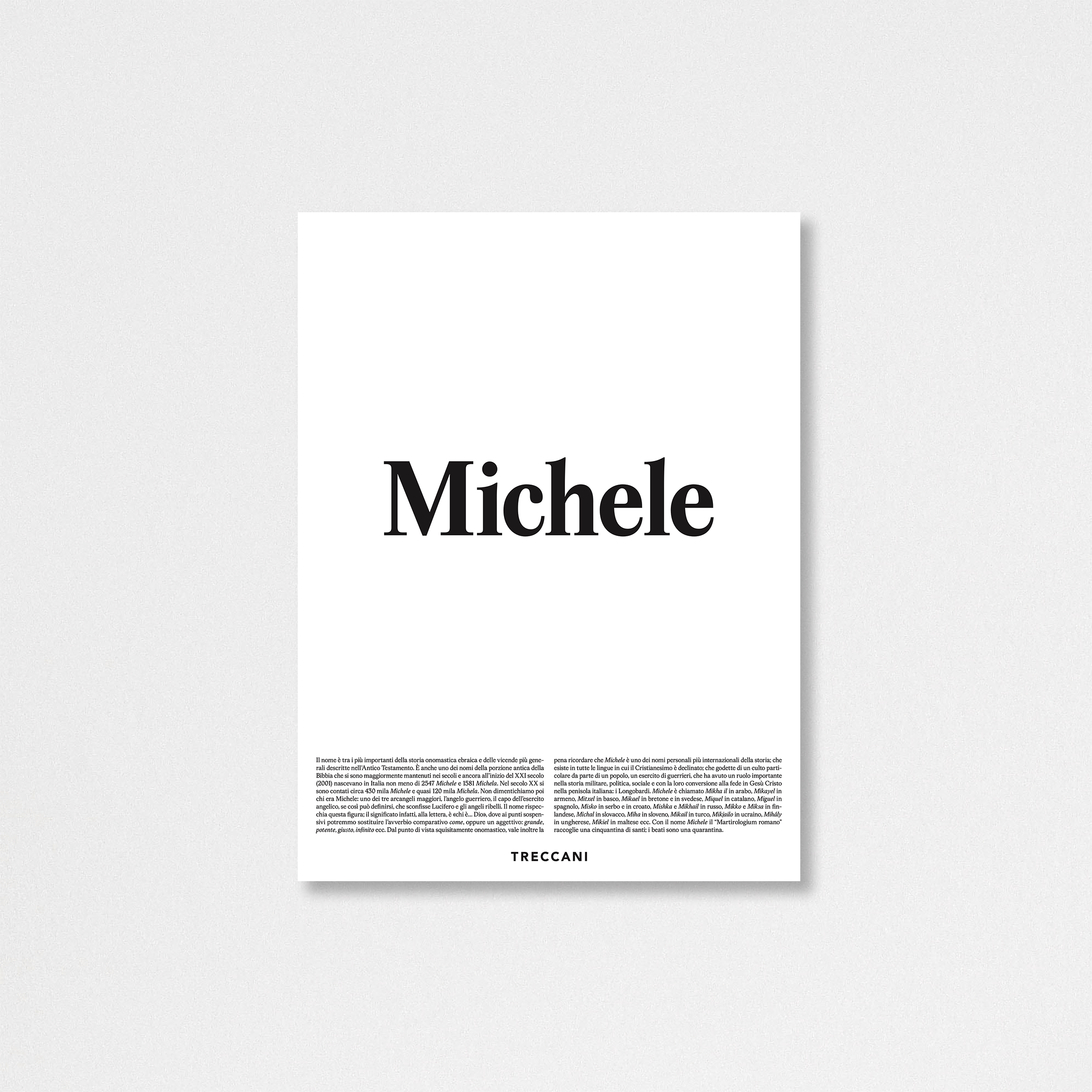 | Definizione | Il nome è tra i più importanti della storia onomastica ebraica e delle vicende più generali descritte nell’Antico Testamento. È anche uno dei nomi della porzione antica della Bibbia che si sono maggiormente mantenuti nei secoli e ancora all’inizio del XXI secolo (2001) nascevano in Italia non meno di 2547 Michele e 1581 Michela. Nel secolo XX si sono contati circa 430 mila Michele e quasi 120 mila Michela. Non dimentichiamo poi chi era Michele: uno dei tre arcangeli maggiori, l’angelo guerriero, il capo dell’esercito angelico, se così può definirsi, che sconfisse Lucifero e gli angeli ribelli. Il nome rispecchia questa figura; il significato infatti, alla lettera, è «chi è… Dio», dove ai punti sospensivi potremmo sostituire l’avverbio comparativo come, oppure un aggettivo: grande, potente, giusto, infinito ecc. Dal punto di vista squisitamente onomastico, vale inoltre la pena ricordare che Michele è uno dei nomi personali più internazionali della storia; che esiste in tutte le lingue in cui il Cristianesimo è declinato; che godette di un culto particolare da parte di un popolo, un esercito di guerrieri, che ha avuto un ruolo importante nella storia militare, politica, sociale e con la loro conversione alla fede in Gesù Cristo nella penisola italiana: i Longobardi. Michele è chiamato Mikha il in arabo, Mikayel in armeno, Mitxel in basco, Mikael in bretone e in svedese, Miquel in catalano, Miguel in spagnolo, Misko in serbo e in croato, Mishka e Mikhail in russo, Mikko e Miksa in finlandese, Michal in slovacco, Miha in sloveno, Mikail in turco, Mikjailo in ucraino, Mihaly in ungherese, Mikiel in maltese ecc. Con il nome Michele il “Martirologium romano” raccoglie una cinquantina di santi; i beati sono una quarantina. |