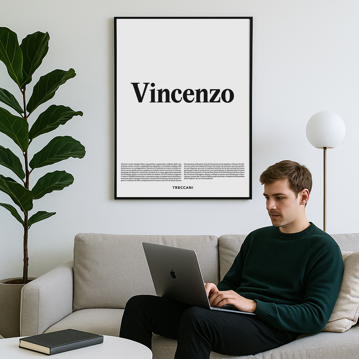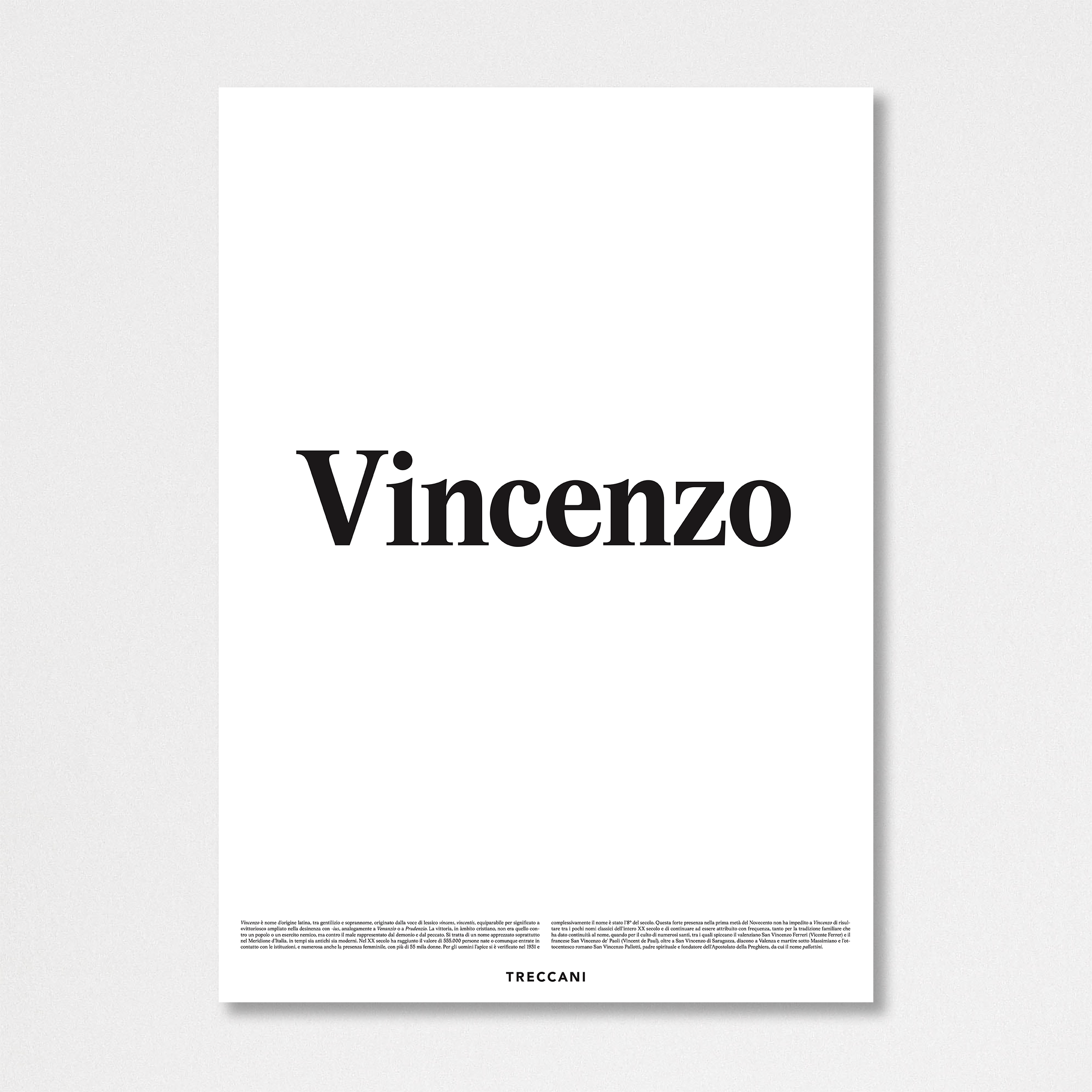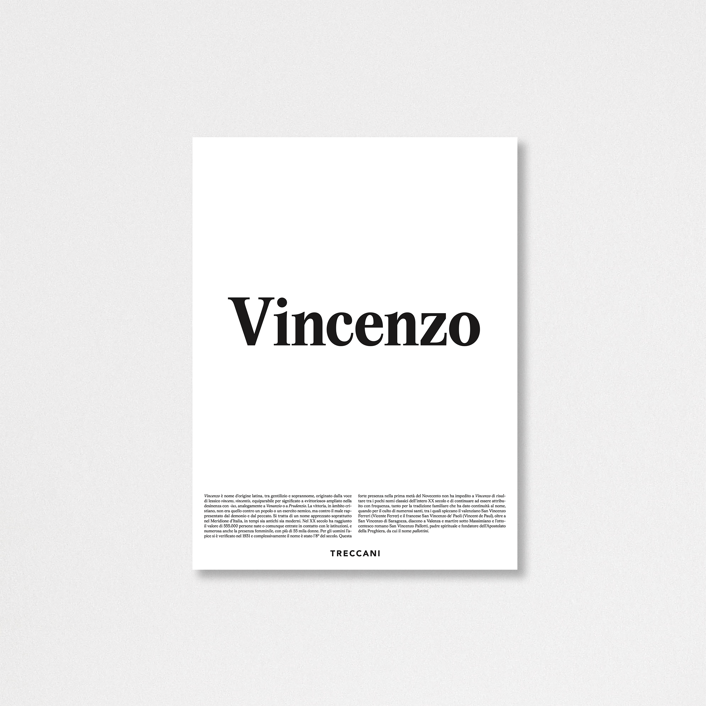 | Definizione | Vincenzo è nome d’origine latina, tra gentilizio e soprannome, originato dalla voce di lessico vincens, vincentis, equiparabile per significato a «vittorioso» ampliato nella desinenza con -ius, analogamente a Venanzio o a Prudenzio. La vittoria, in àmbito cristiano, non era quello contro un popolo o un esercito nemico, ma contro il male rappresentato dal demonio e dal peccato. Si tratta di un nome apprezzato soprattutto nel Meridione d’Italia, in tempi sia antichi sia moderni. Nel XX secolo ha raggiunto il valore di 555.000 persone nate o comunque entrate in contatto con le istituzioni, e numerosa anche la presenza femminile, con più di 55 mila donne. Per gli uomini l’apice si è verificato nel 1931 e complessivamente il nome è stato l’8º del secolo. Questa forte presenza nella prima metà del Novecento non ha impedito a Vincenzo di risultare tra i pochi nomi classici dell’intero XX secolo e di continuare ad essere attribuito con frequenza, tanto per la tradizione familiare che ha dato continuità al nome, quando per il culto di numerosi santi, tra i quali spiccano il valenziano San Vincenzo Ferreri (Vicente Ferrer) e il francese San Vincenzo de’ Paoli (Vincent de Paul), oltre a San Vincenzo di Saragozza, diacono a Valenza e martire sotto Massimiano e l’ottocentesco romano San Vincenzo Pallotti, padre spirituale e fondatore dell’Apostolato della Preghiera, da cui il nome pallottini. |