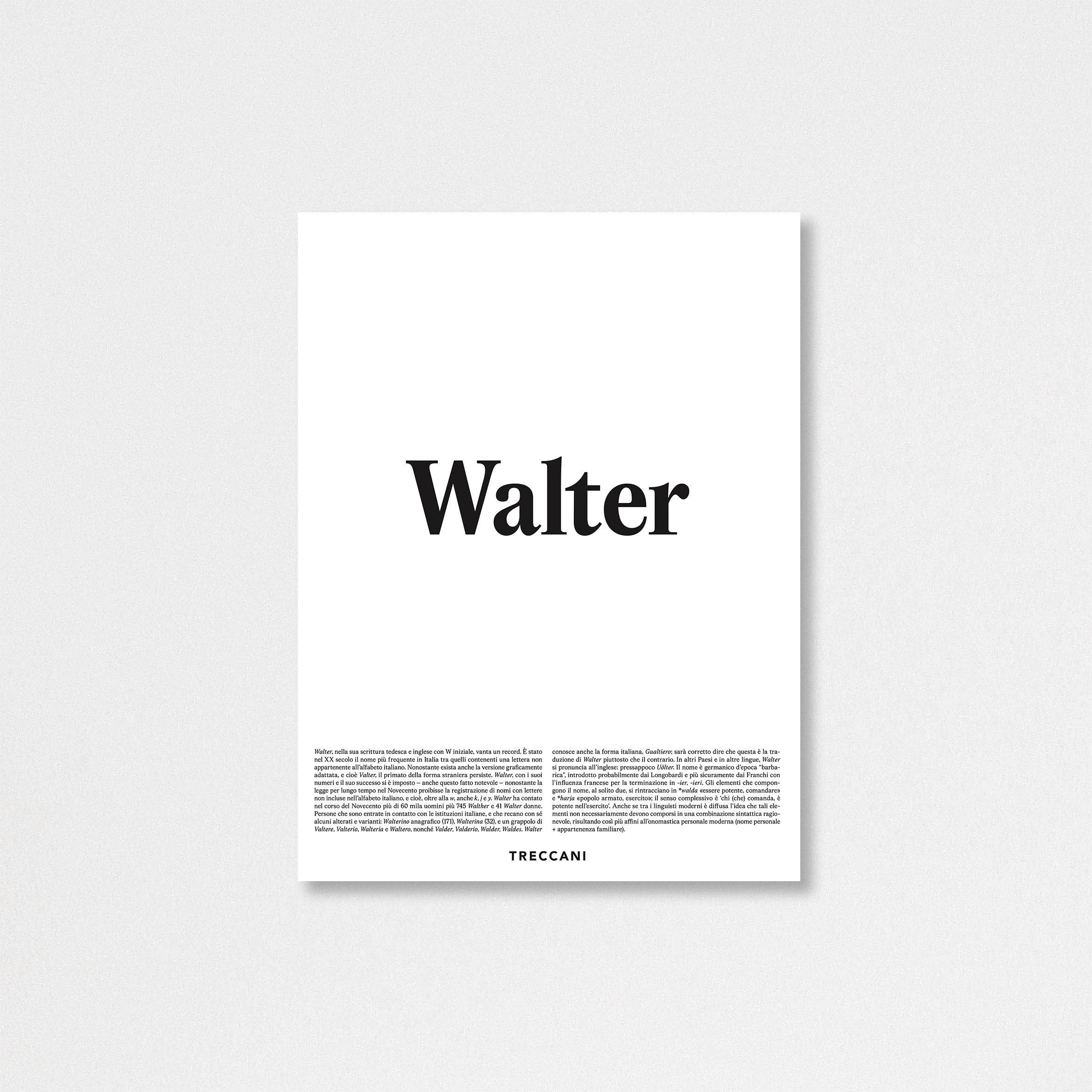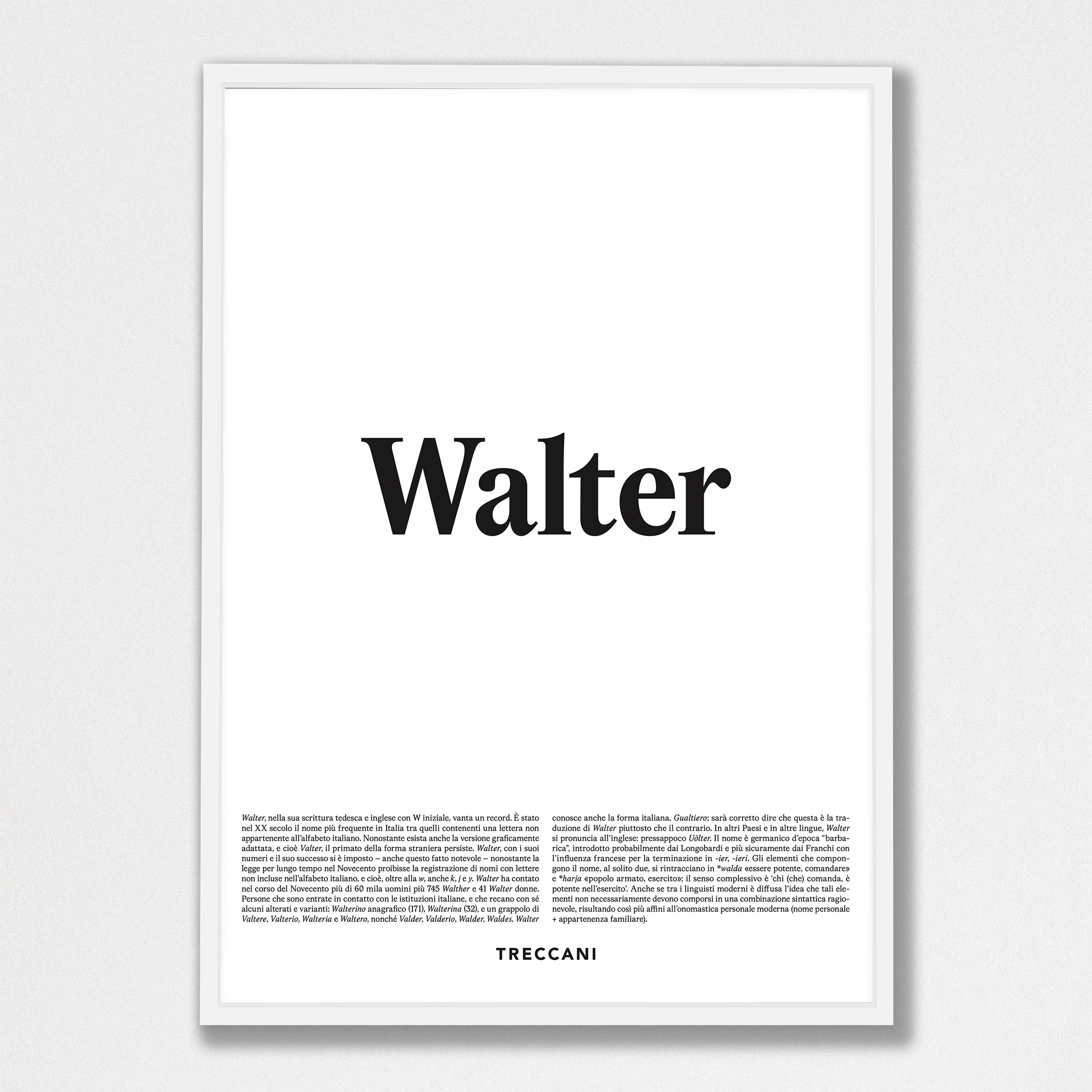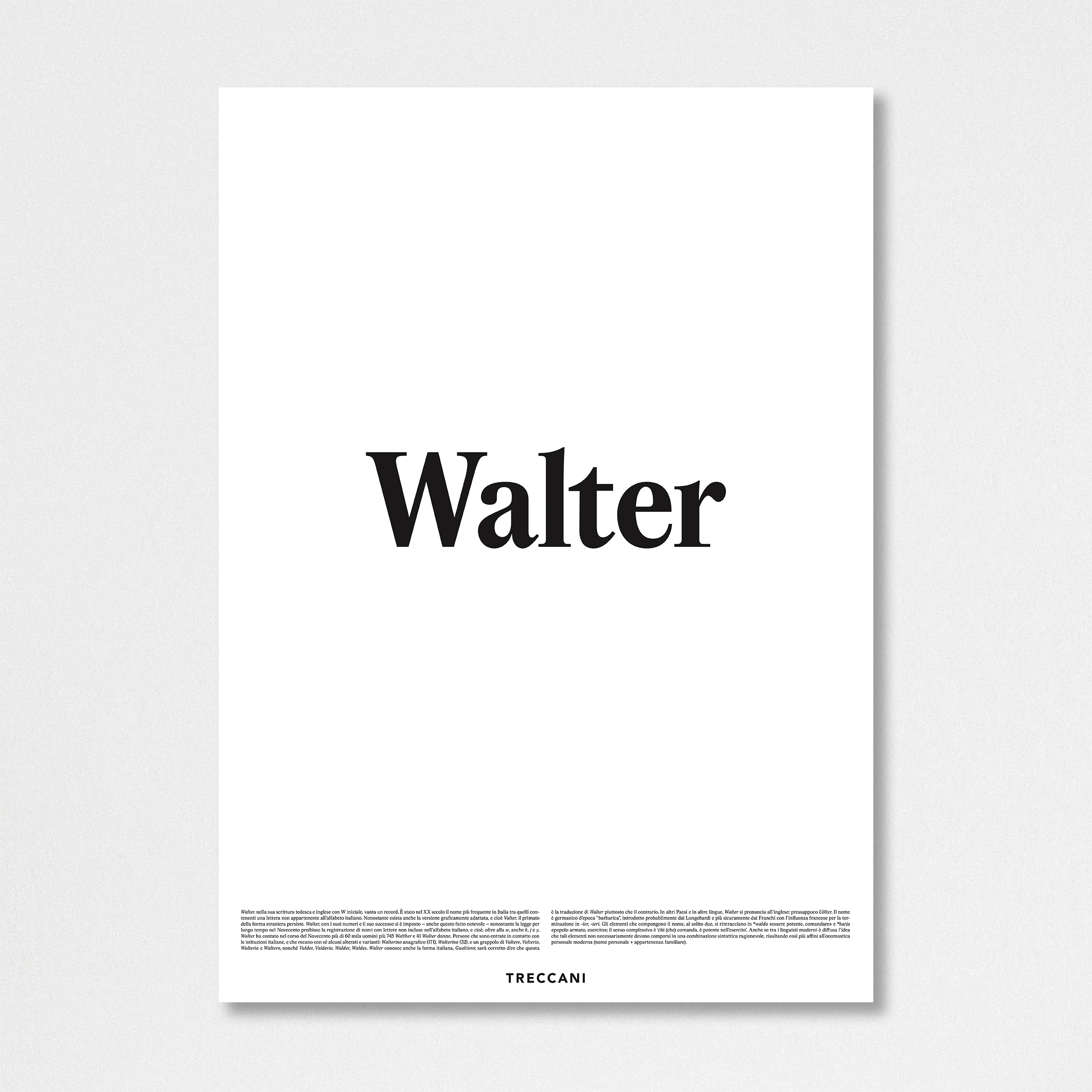 | Definizione | Walter, nella sua scrittura tedesca e inglese con W iniziale, vanta un record. È stato nel XX secolo il nome più frequente in Italia tra quelli contenenti una lettera non appartenente all’alfabeto italiano. Nonostante esista anche la versione graficamente adattata, e cioè Valter, il primato della forma straniera persiste. Walter, con i suoi numeri e il suo successo si è imposto – anche questo fatto notevole – nonostante la legge per lungo tempo nel Novecento proibisse la registrazione di nomi con lettere non incluse nell’alfabeto italiano, e cioè, oltre alla w, anche k, j e y. Walter ha contato nel corso del Novecento più di 60 mila uomini più 745 Walther e 41 Walter donne. Persone che sono entrate in contatto con le istituzioni italiane, e che recano con sé alcuni alterati e varianti: Walterino anagrafico (171), Walterina (32), e un grappolo di Valtere, Valterio, Walteria e Waltero, nonché Valder, Valderio, Walder, Waldes. Walter conosce anche la forma italiana, Gualtiero; sarà corretto dire che questa è la traduzione di Walter piuttosto che il contrario. In altri Paesi e in altre lingue, Walter si pronuncia all’inglese: pressappoco Uolter. Il nome è germanico d’epoca “barbarica”, introdotto probabilmente dai Longobardi e più sicuramente dai Franchi con l’influenza francese per la terminazione in -ier, -ieri. Gli elementi che compongono il nome, al solito due, si rintracciano in *walda «essere potente, comandare» e *harja «popolo armato, esercito»; il senso complessivo è ‘chi (che) comanda, è potente nell’esercito’. Anche se tra i linguisti moderni è diffusa l’idea che tali elementi non necessariamente devono comporsi in una combinazione sintattica ragionevole, risultando così più affini all’onomastica personale moderna (nome personale + appartenenza familiare). |