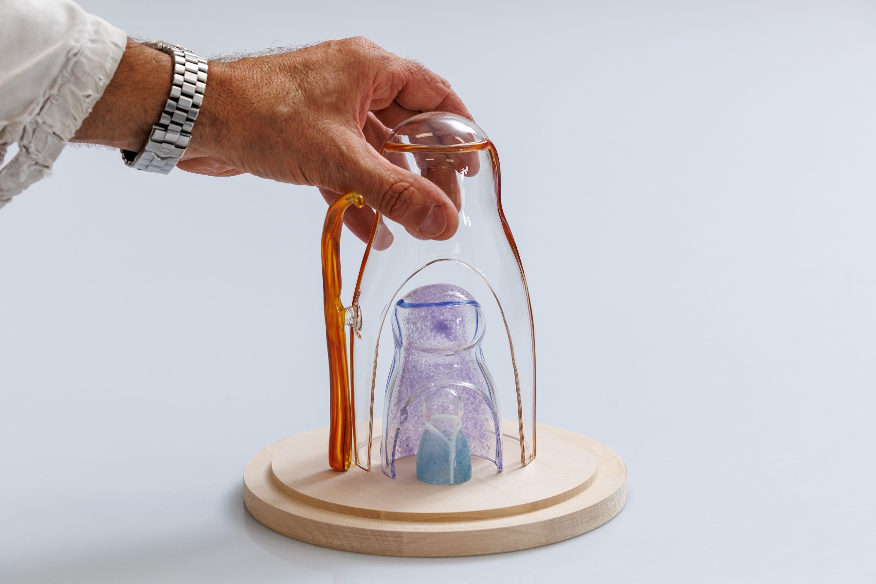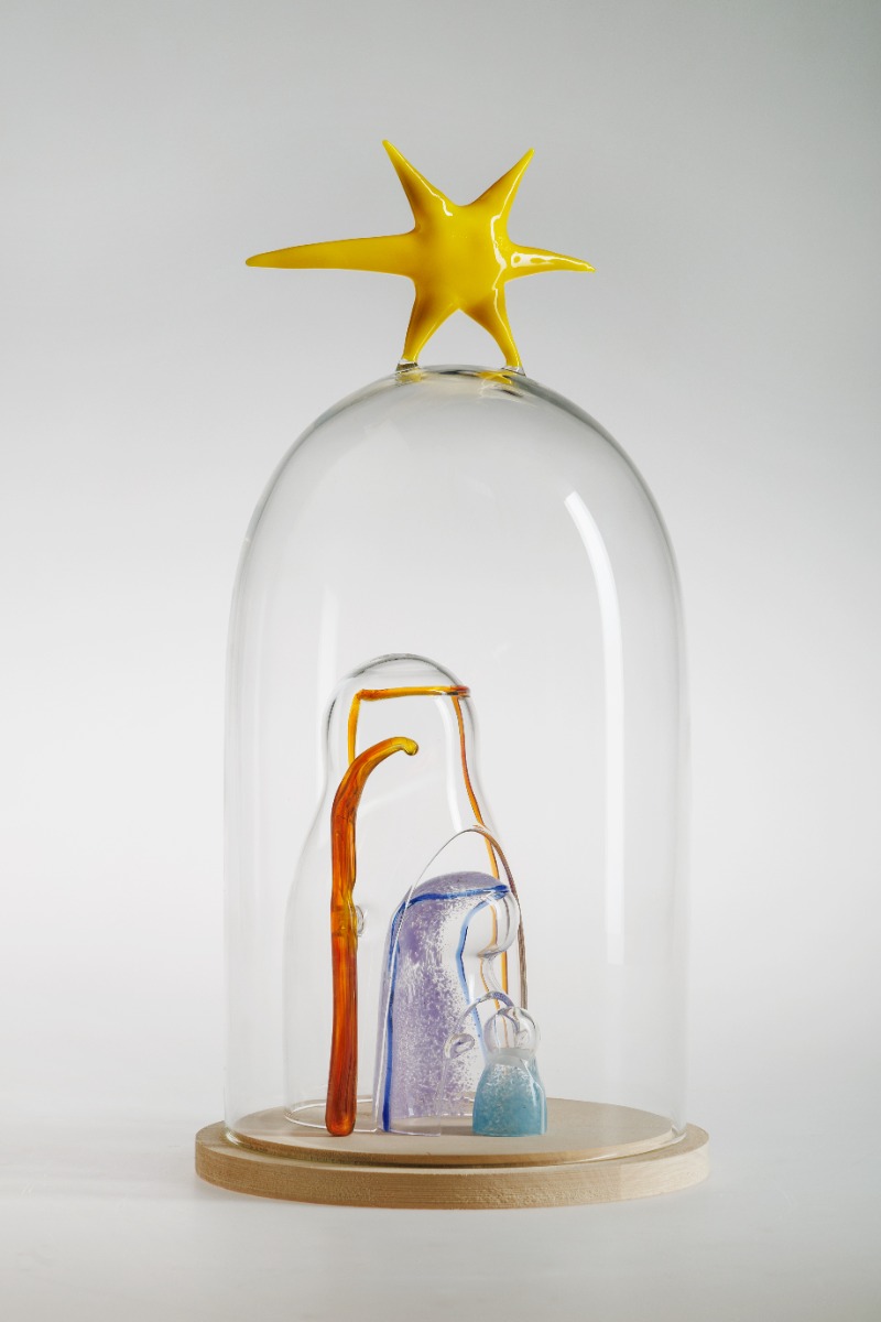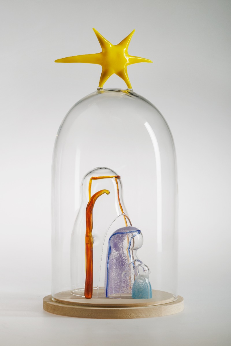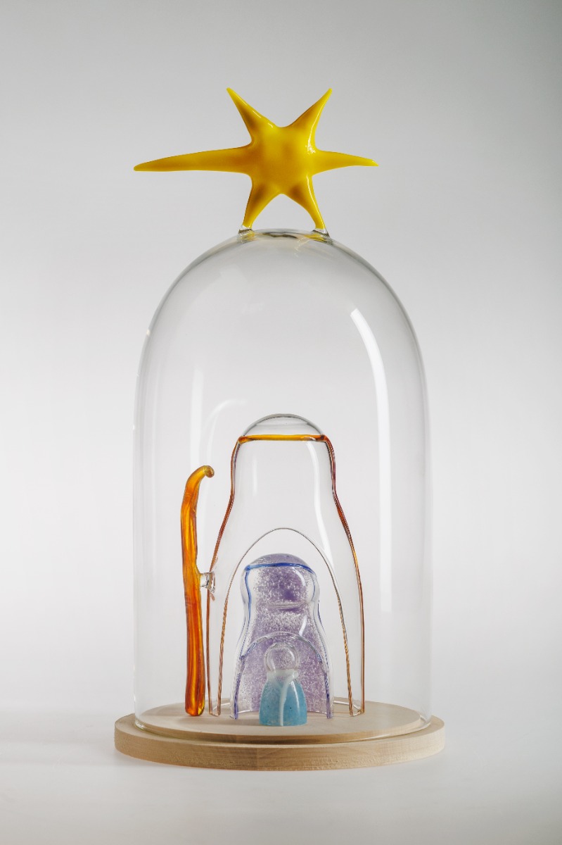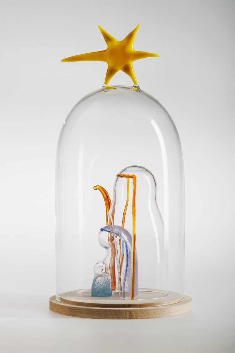 Una composizione dei personaggi della Natività in vetro in cui ogni personaggio avvolge e ingloba il successivo e tutti sono protetti da una simbolica grotta chiusa illuminata dalla stella cometa.