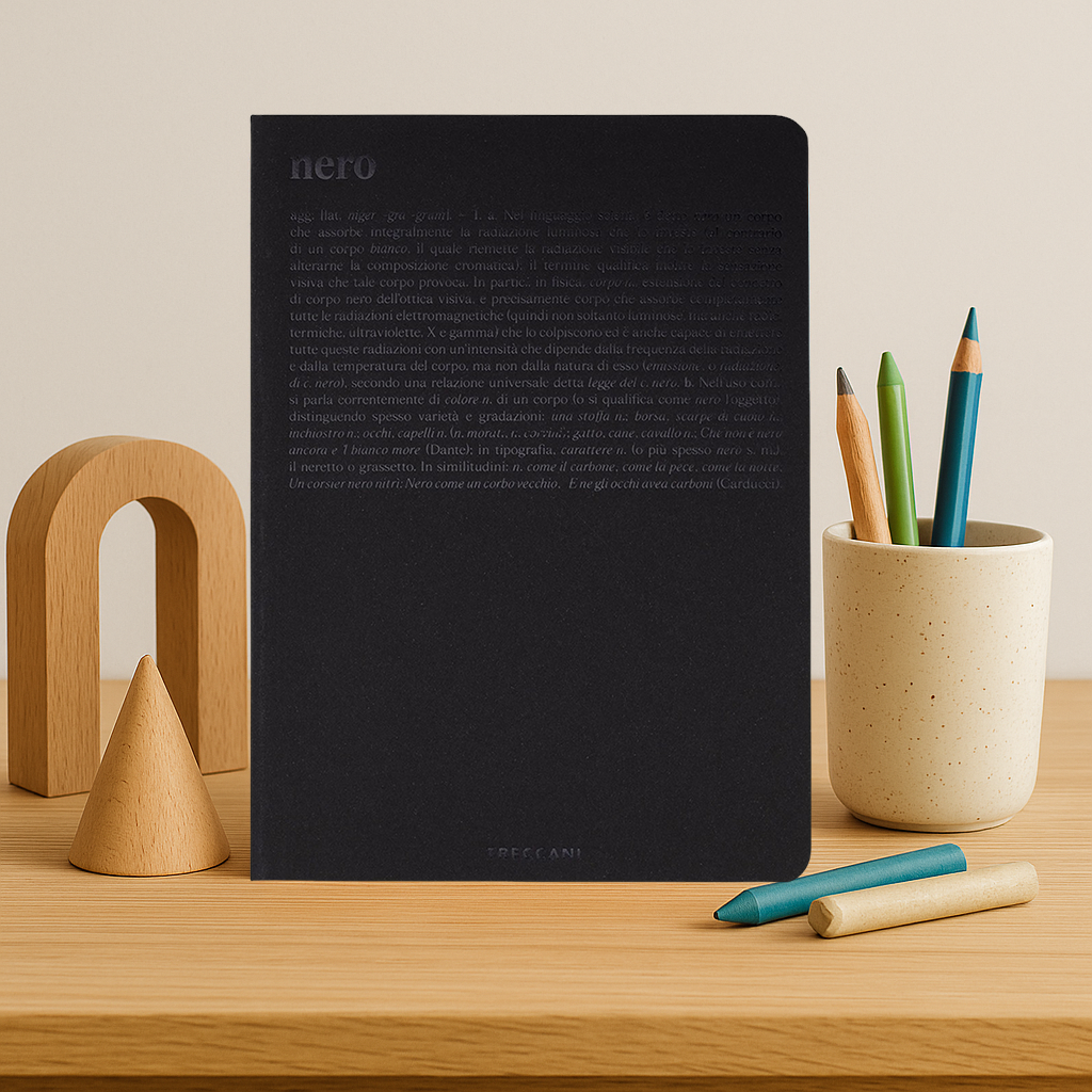 Dallo stile sobrio ed elegante, Quaderno a righe Linea Colori è realizzato con carte di pregio delle migliori cartiere italiane e confezionato interamente in Italia. La copertina in cartoncino nero è stampata in lamina dello stesso colore. Coniugando funzionalità e design, perizia artigianale ed estro concettuale, sapere e saper fare, il quaderno Treccani ci invita a riscoprire la storia e l’etimologia della parola, attraverso la sua definizione sul Vocabolario Treccani.
