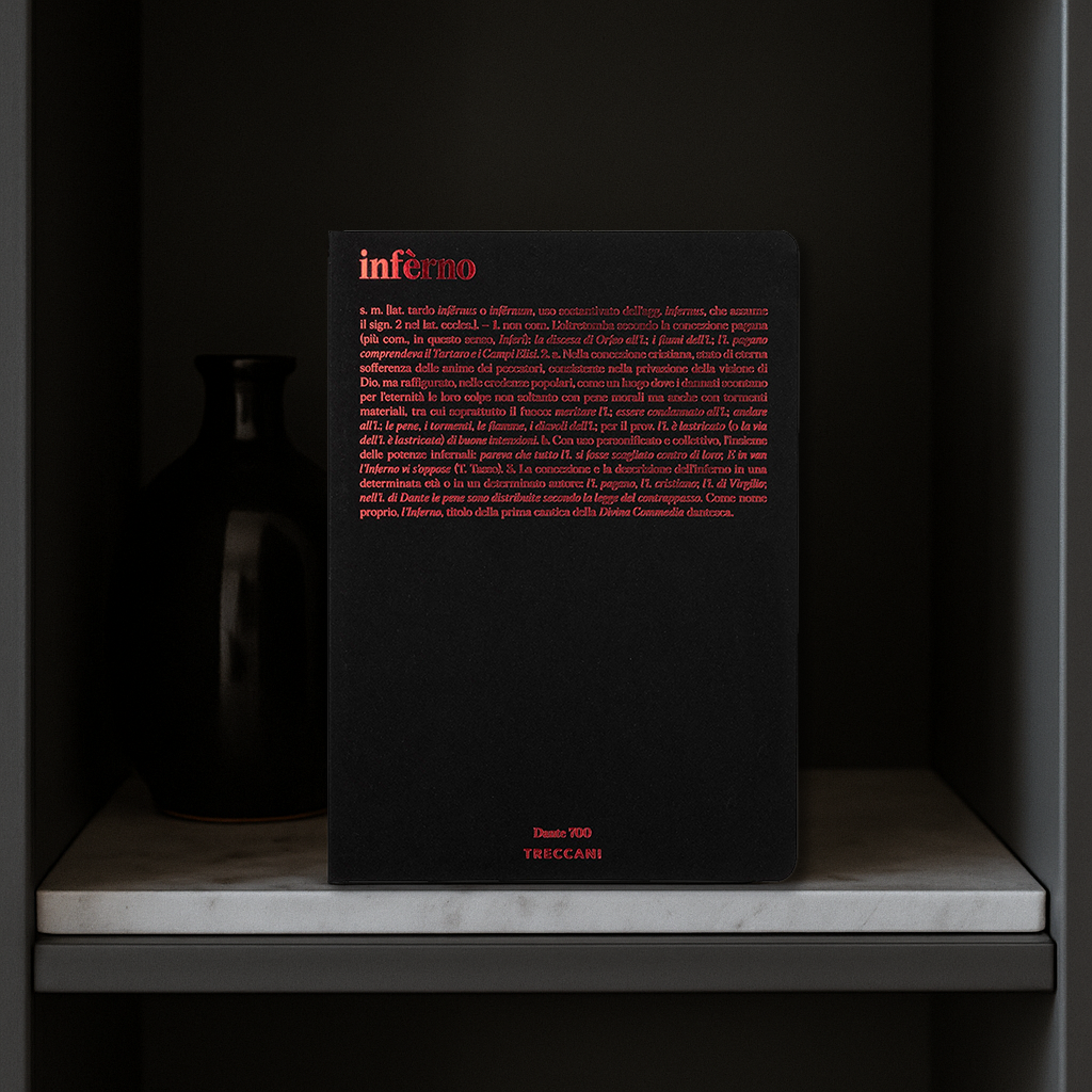 Il quaderno Inferno, realizzato con carte di pregio delle migliori cartiere italiane, presenta una copertina in cartoncino nero con una stampa in lamina rossa. Nella prima pagina del quaderno vengono presentati i primi 12 versi del Canto I dell’Inferno.