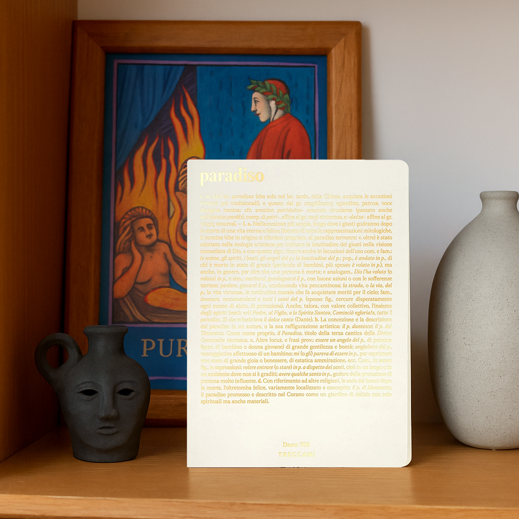 Il quaderno Paradiso, realizzato con carte di pregio delle migliori cartiere italiane, presenta una copertina in cartoncino bianco con una stampa in lamina oro. Nella prima pagina del quaderno vengono presentati i primi 12 versi del Canto I del Paradiso.