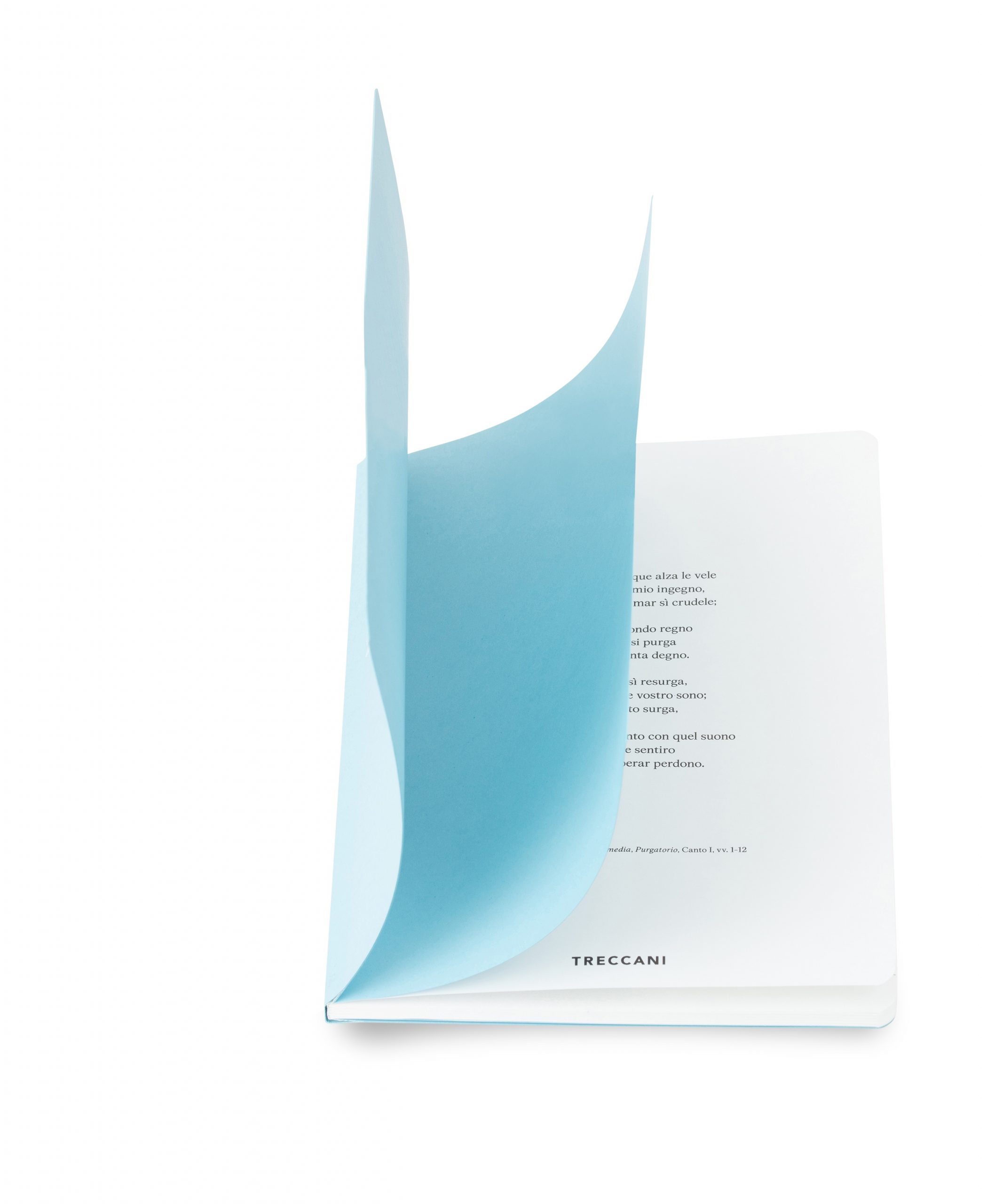 In occasione del 700esimo anniversario dantesco, Treccani lancia un’edizione speciale dei quaderni Definizione, dedicati alle Cantiche della Divina Commedia: Inferno,Purgatorio, e Paradiso. Sulla copertina vengono riportate le definizioni delle stesse presenti sul Vocabolario Treccani. Il quaderno Purgatorio, realizzato con carte di pregio delle migliori cartiere italiane, presenta una copertina in cartoncino celeste con una stampa in lamina bianca. Nella prima pagina del quaderno vengono presentati i primi 12 versi del Canto I del Purgatorio.