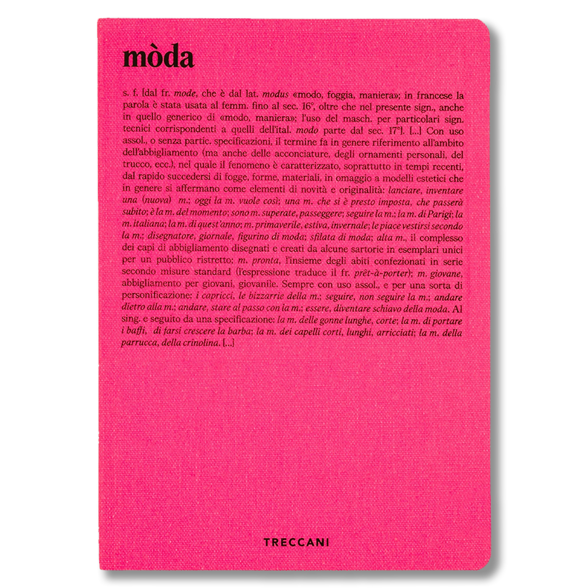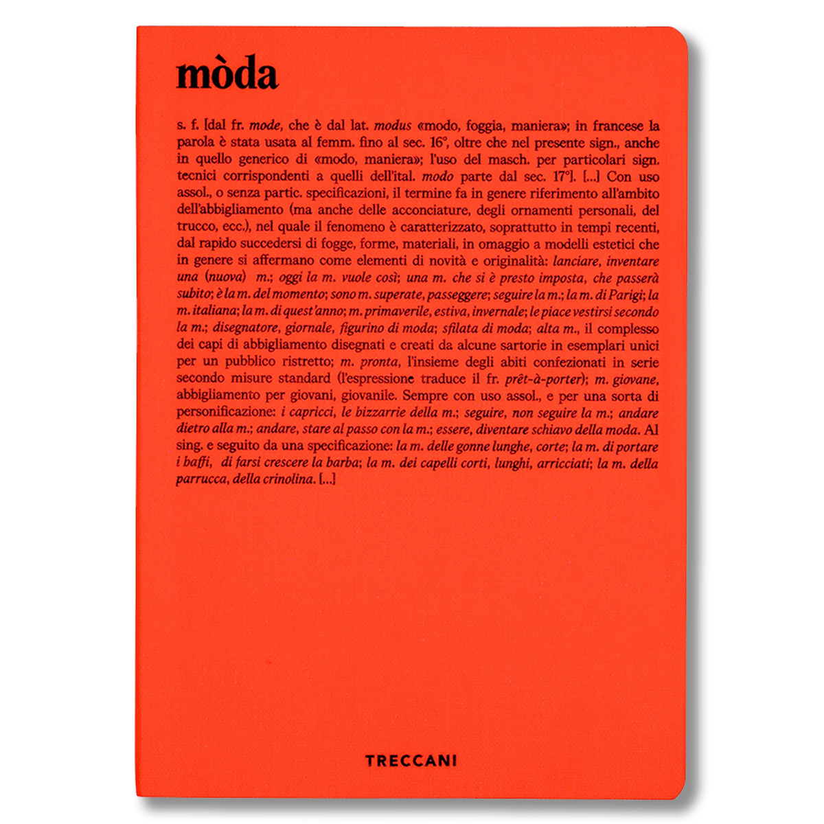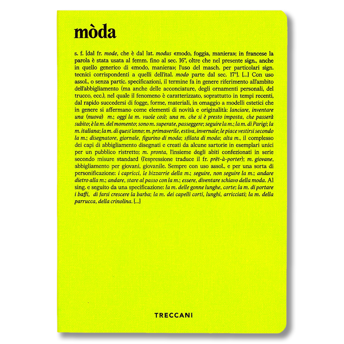 Il quaderno Moda a fogli bianchi è realizzato con carte di pregio delle migliori cartiere italiane e confezionato interamente in Italia. La copertina in tela fluo riporta una stampa a caldo nera. Il quaderno fa parte della linea Definizione, una serie di oggetti per tutti i giorni, nata per riscoprire l’importanza di un immenso patrimonio culturale comune: la lingua italiana.