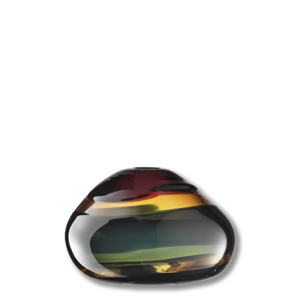 Dettagli | Design di Luciano Gaspari; Vetro soffiato a mano, applicazione fasce a rilievo; Colore caramello; Dimensioni 33 × 33 × 20 cm |