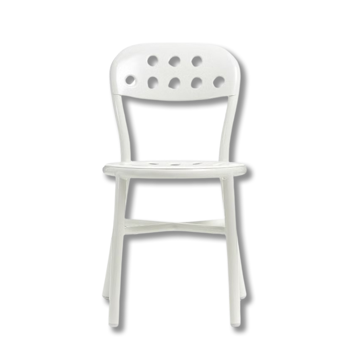 Versione anche con braccioli. Materiali: struttura in tubo di alluminio verniciato poliestere. Sedile e schienale in lamiera di alluminio forata verniciata poliestere. Adatta anche per esterno.
