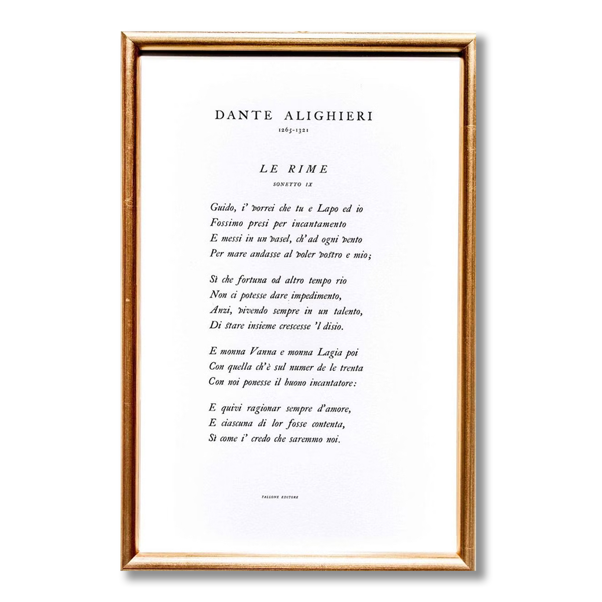 L'amicizia celebrata da Dante in un sonetto immortale, composto a mano lettera per lettera e impresso su carta di puro cotone allestita appositamente in Toscana.