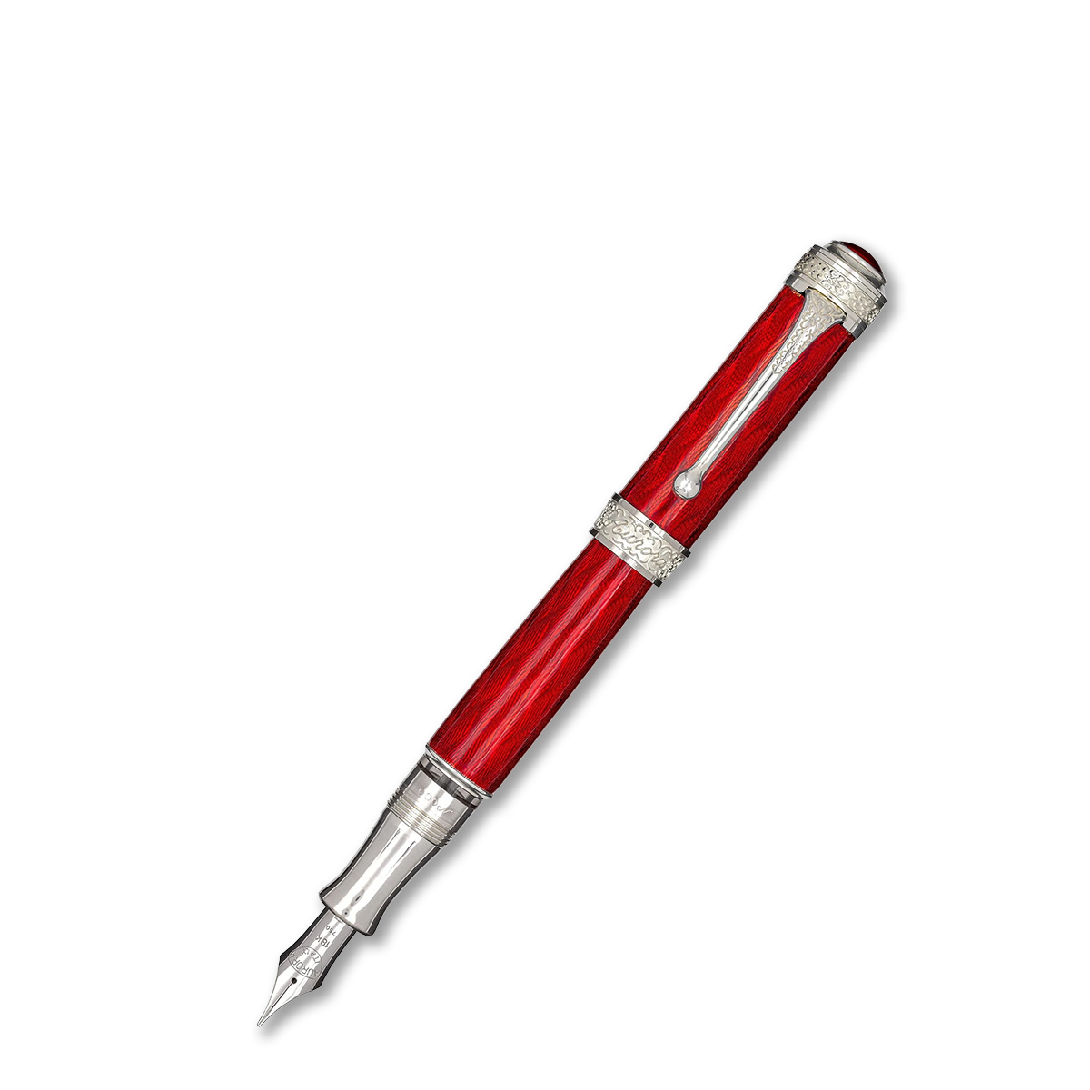 Dettagli | Pistone in argento massiccio; Guilloché ‘flamé’ ricoperta in lacca smaltata rossa; Finiture in argento massiccio; Pennino in oro massiccio rodiato da 18 kt |