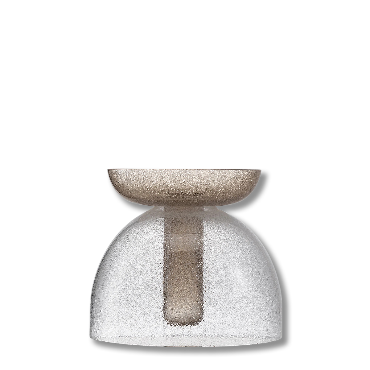 Dettagli | Design di Alberto Lago; Vetro sommerso, sfumato, modellato a mano, incalmo; Colore cristallo pulegoso/grigio kaiser pulegoso; Dimensioni 22 × 25 cm |